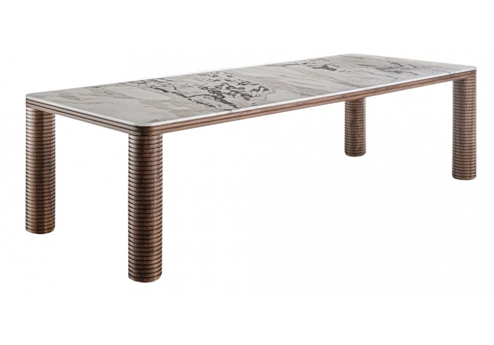 Sansiro diseñada por Meneghello Paolelli para Porada es una mesa de comedor rectangular con esquinas redondeadas, estructura en nogal canaletta macizo, tablero en mármol o roca y patas torneadas compuestas por cuatro maderas macizas. Las patas muestran signos de unión cerca de la unión entre los bloques.