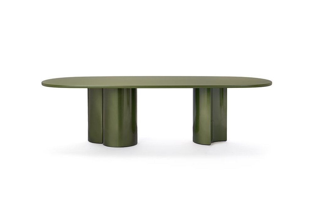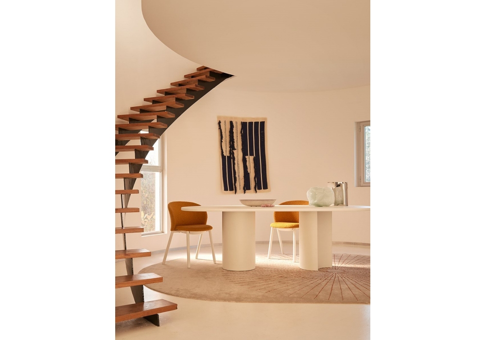 Bol diseñada por Zaven para Zanotta es una mesa con bases en poliuretano rígido lacado mate en color talco, caramelo y algas o lacado brillante en talco, caramelo metalizado y algas metalizadas combinado con tableros de MDF en los mismos colores lacados mate.