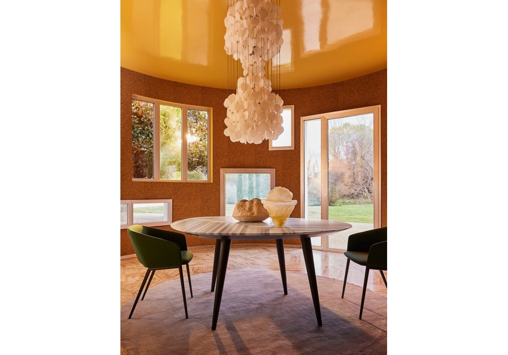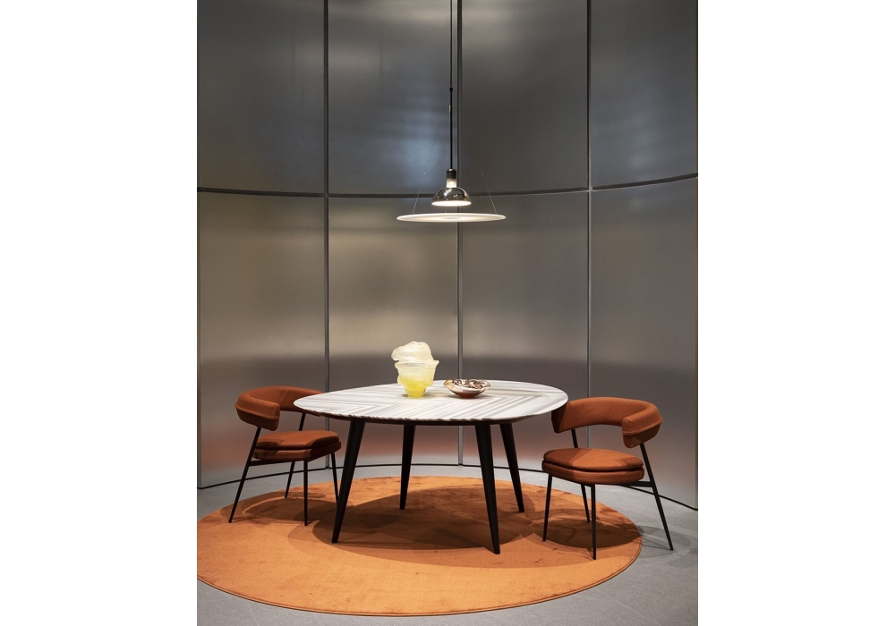 Tweed Marble diseñada por Garcia Cumini para Zanotta es una mesa con tablero en mármol Striato Olimpico con barniz protector antimanchas en poliéster transparente opaco. Bajo encimera en MDF lacado negro mate. Patas en tubo de acero pintado negro mate.