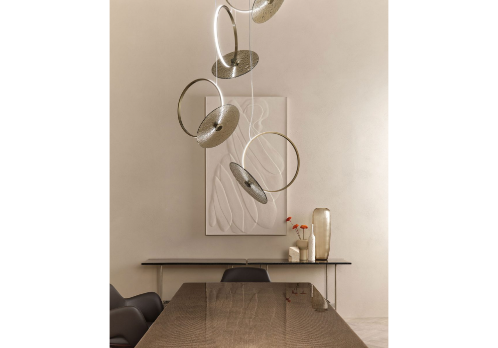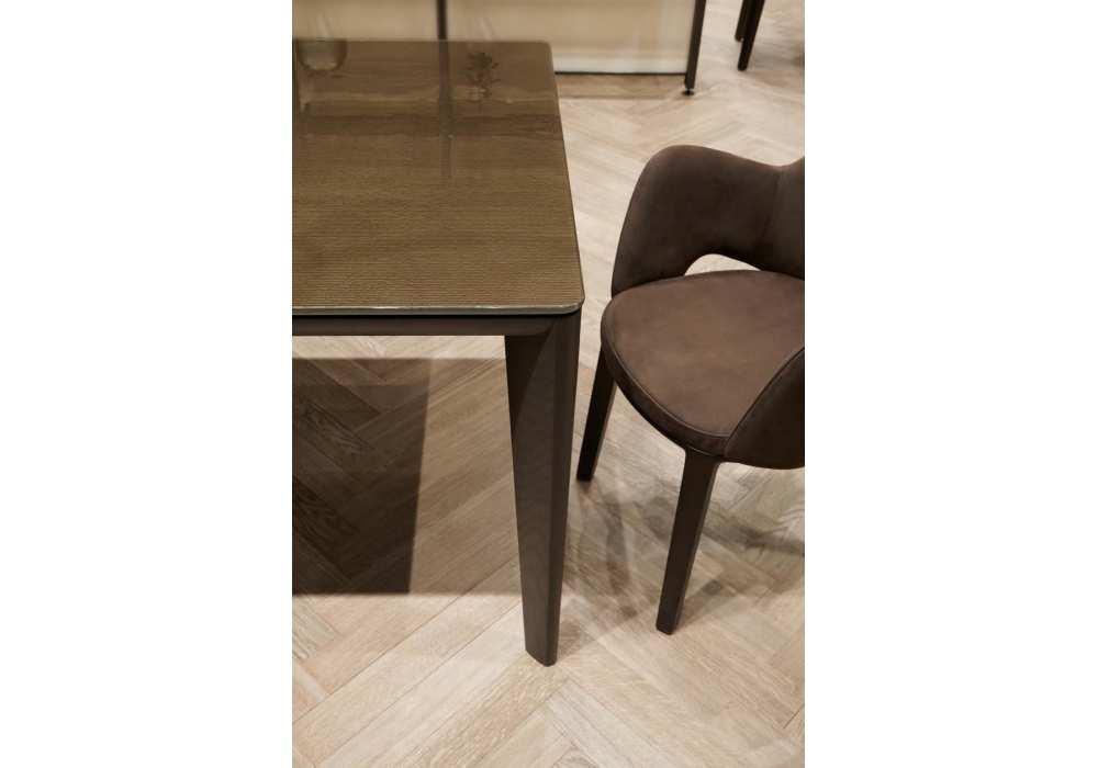Flaminio diseñada por Studio Klass para Fiam es una mesa con tablero en vidrio fundido y templado, trasera pintada con colores metalizados. Estructura de madera maciza disponible en acabado Tabaco o negro tratado térmicamente.