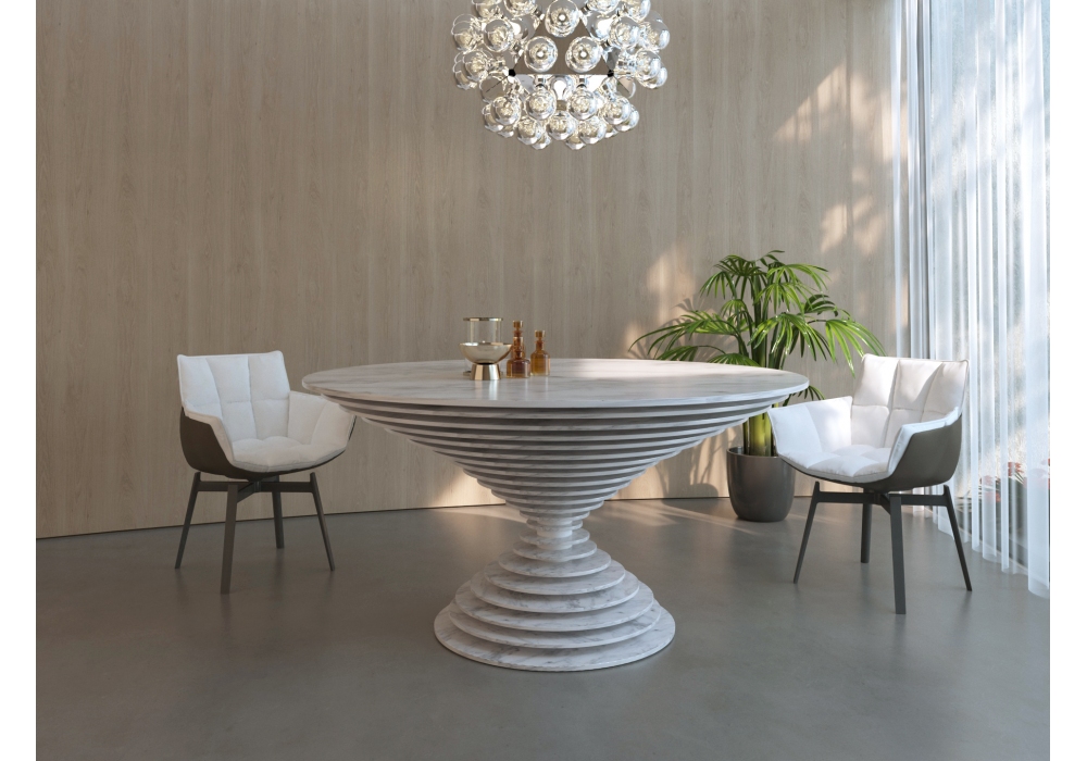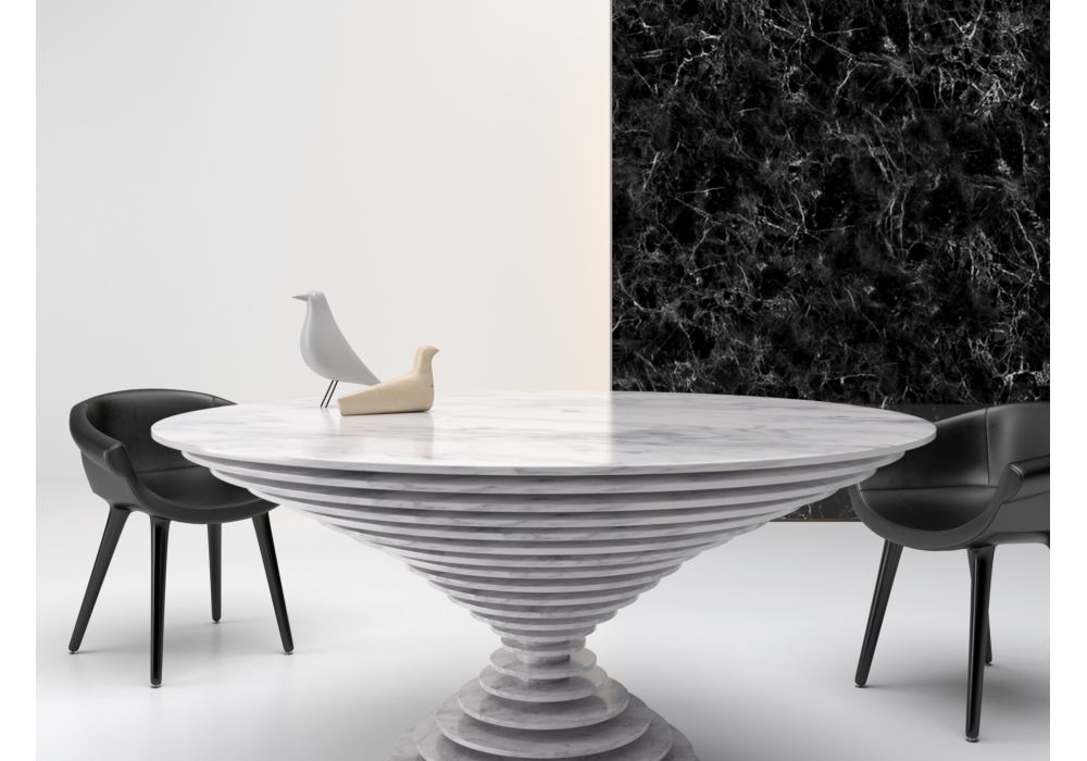 Calice diseñada por Serra By Milia para Escooh es una mesa redonda con estructura portante de metal, planos horizontales y tapa de mármol en diferentes acabados. Bajo pedido es posible combinar diferentes acabados.