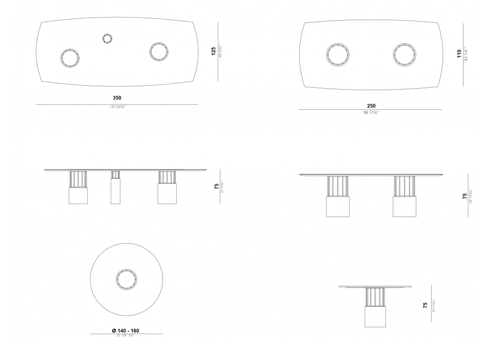 | Dimensiones | 350 x 125 x H 75 cm; 250 x 110 x H 75 cm; Ø 140 x H 75 cm; Ø 160 x H 75 cm. |