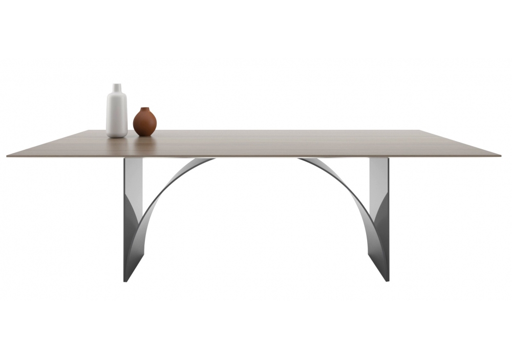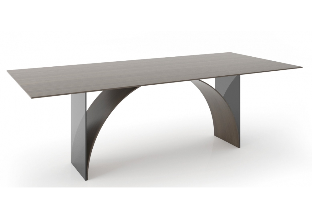 Bridge diseñada por Serra By Milia para Escooh es una mesa con base en metal curvo o chapado en madera maciza y pies en vidrio templado. La parte superior está hecha de madera maciza.