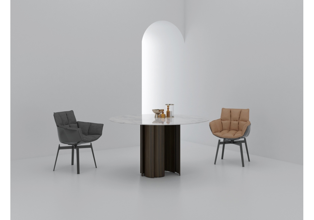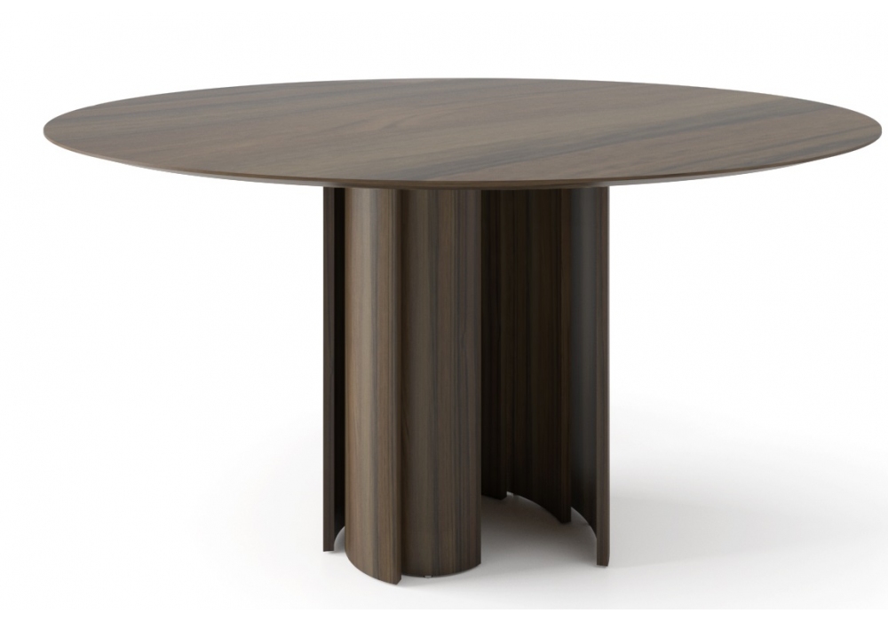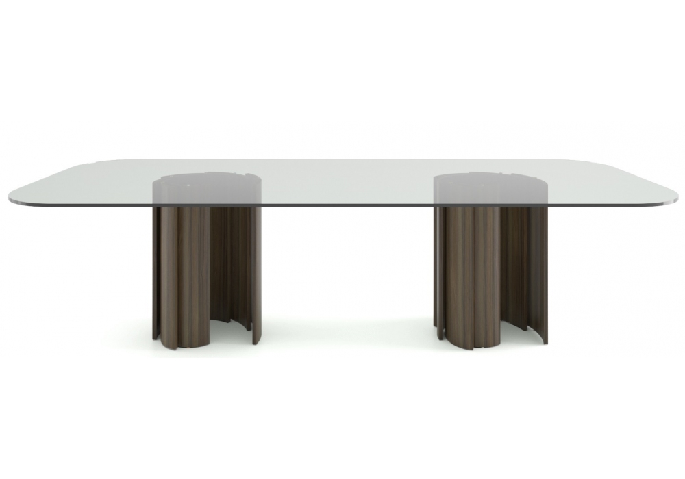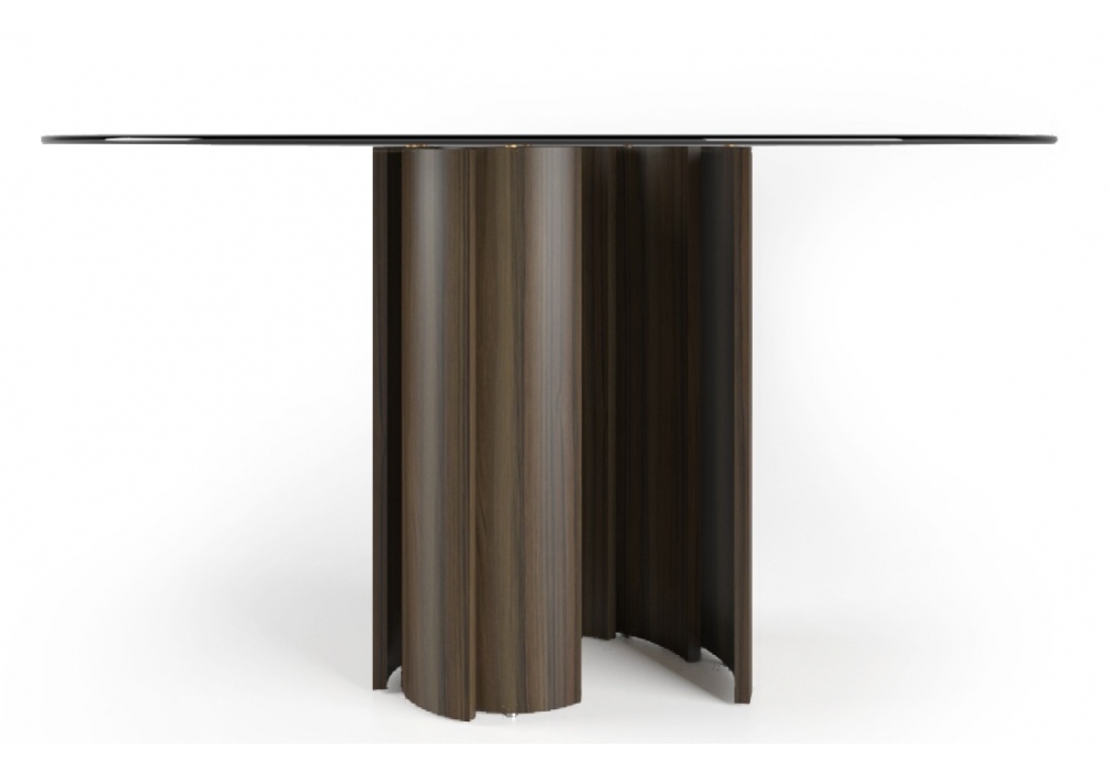 Aurea diseñada por Serra By Milia para Escooh es una mesa con base compuesta por seis elementos curvos en nogal Canaletto macizo y tapa en vidrio, madera o mármol. Soportes en metal bronceado cepillado. Disponible en diferentes dimensiones.