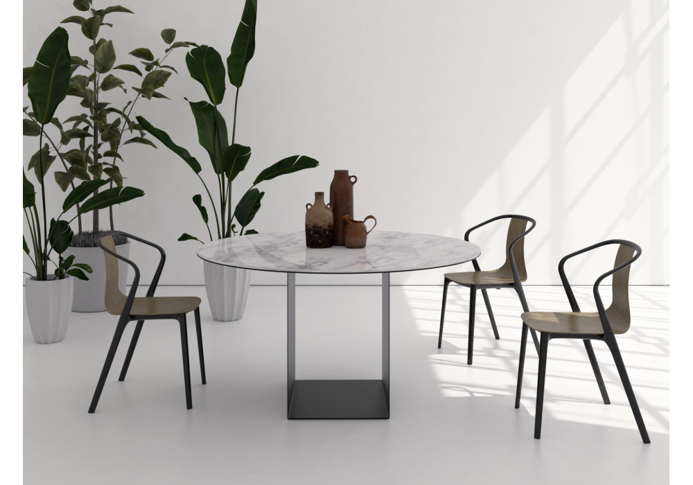 Omega diseñada por Serra By Milia para Escooh es una mesa con base de metal doblado y tapa de mármol o madera. Disponible en diferentes dimensiones.