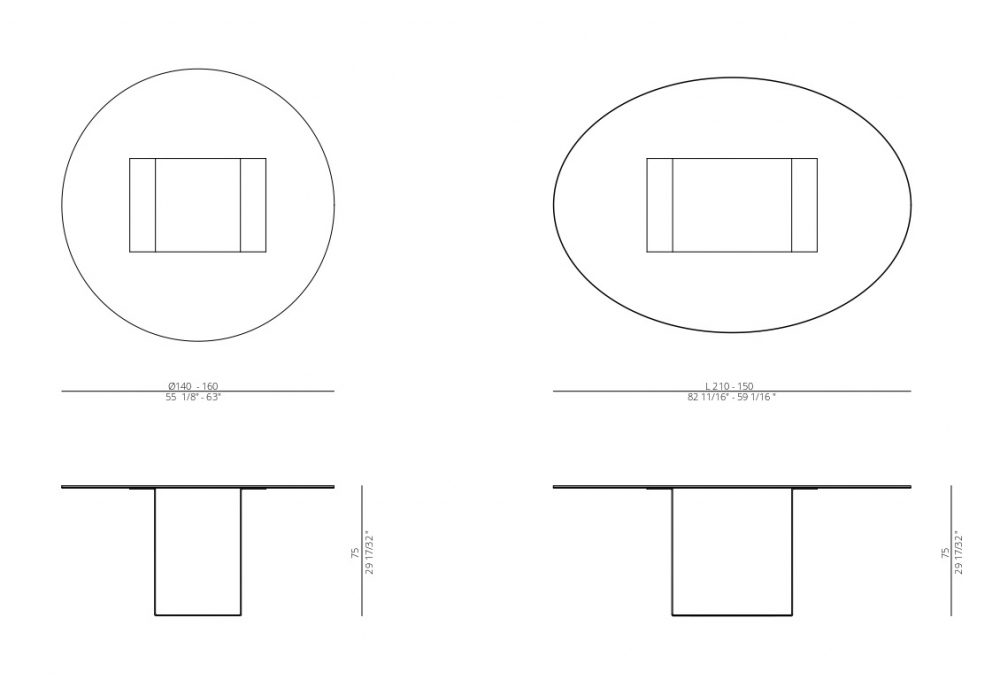 | Dimensiones | Ø 140 x H 75 cm; Ø 160 x H 7 cm; Ø 210 x H 75 cm (oval); Ø 150 x H 75 cm (oval). |