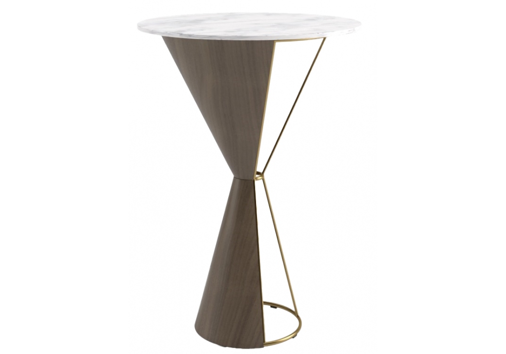 Essential diseñada por Serra By Milia para Escooh es una mesa de bar con base compuesta por dos elementos troncocónicos superpuestos en metal o enchapado en madera. La parte superior está hecha de vidrio, madera o mármol.