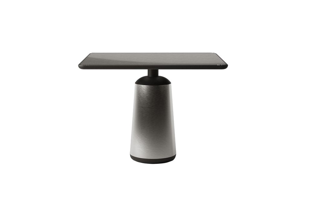 Marien Cuadrado diseñada por Marco Piva para Casamania & Horm es una mesa que reúne una imponente base, un tronco de cono con acabados transversales, con una tapa en cristal negro brillo. El cristal se mantiene perfectamente en su base, permitiendo un fino borde perimetral para emerger .