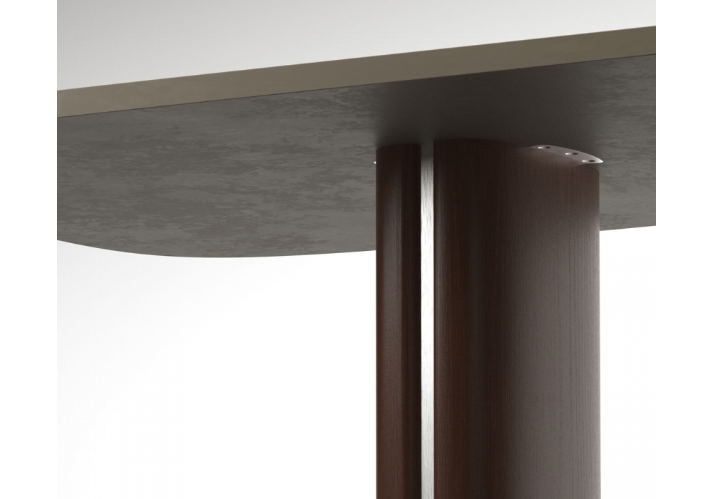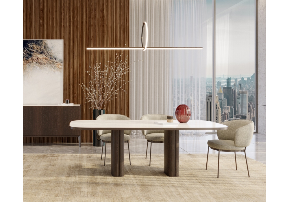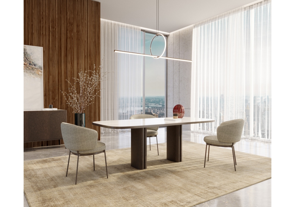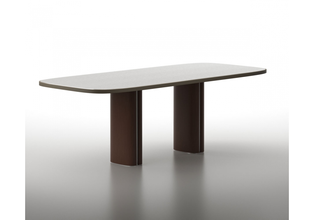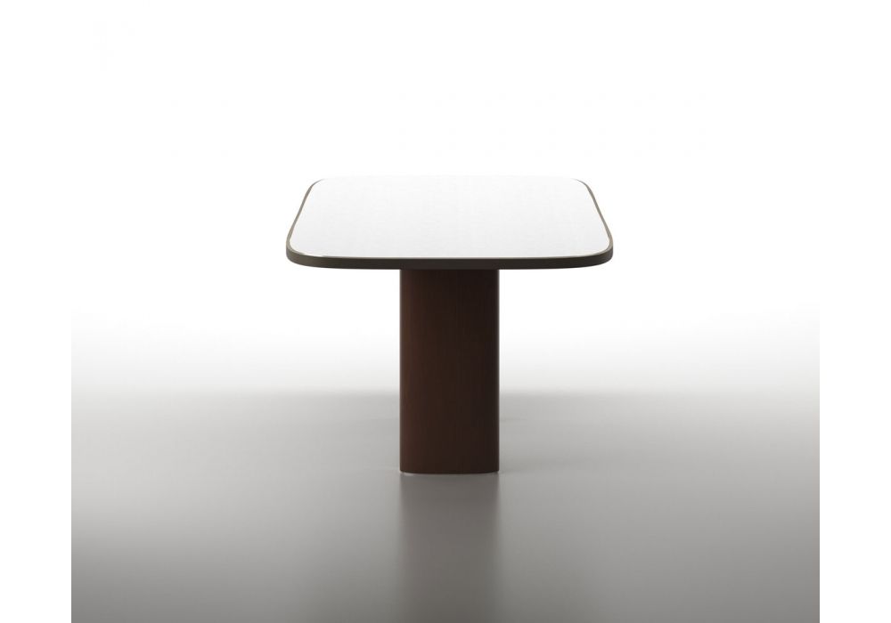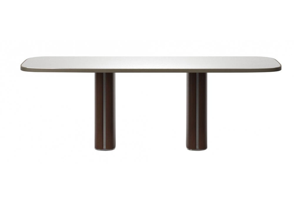 Trafalgar Rectangular diseñada por Marco Piva para Casamania & Horm es una mesa disponible en dos dimensiones, se compone de una tapa con esquinas redondeadas y una base de madera con inserciones de metal. Este paralelepípedo se coloca sobre una placa de soporte de metal y con forma cuadrangular forma pero con ángulos fluidos que parecen iluminar toda la estructura.