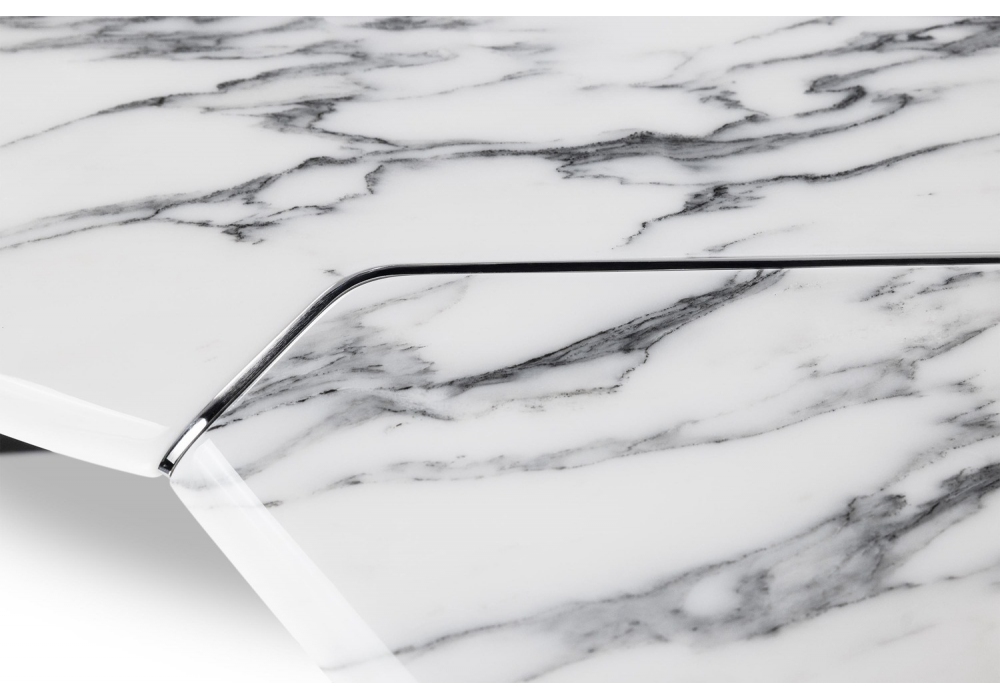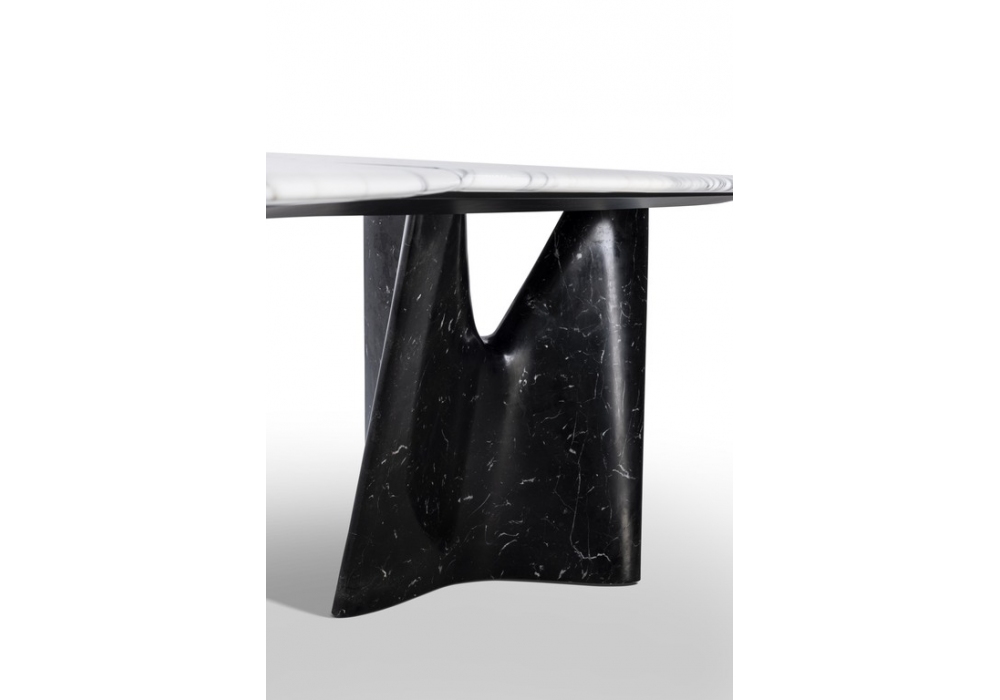 Infinitamente diseñada por Roberto Lazzeroni para Poltrona Frau es una mesa de edición limitada disponible en dos variantes: ovalada de 220x124 cm y ovalada doble escalonada de 340x120 cm. El tablero de la mesa es de mármol Bianco Levigliani brillo, tratado con un barniz de poliéster transparente que mejora su resistencia superficial y evita la absorción de líquidos. La tapa ovalada doble escalonada consta de dos partes contrapuestas unidas por un inserto de hoja de metal de acero inoxidable pulido que remata la línea de unión. La base de mármol Nero Marquinia, simple en la versión más pequeña de la mesa y doble en la más grande, está tallada a partir de un monolito esculpido mecánicamente y acabado a mano.