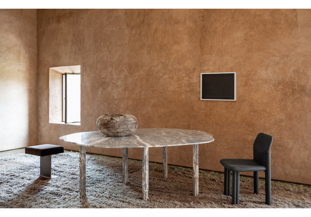 Orpheus diseñada por Lorenzo Bini para Tacchini es una mesa en mármol flor de durazno, sostenida por 5 patas obtenidas combinando tiras ligeramente escalonadas del mismo mármol.