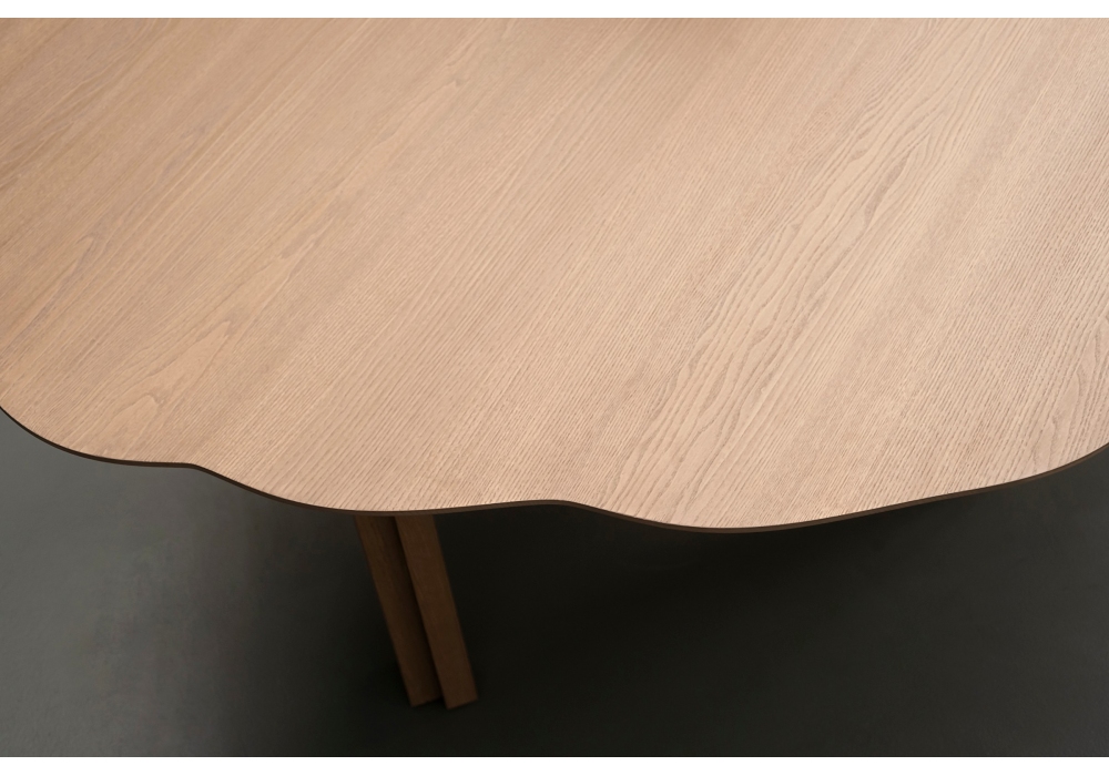 Parker diseñada por Lorenzo Bini para Tacchini es una mesa en roble gris o natural, sostenida por 5 patas obtenidas combinando listones ligeramente escalonados de la misma madera.