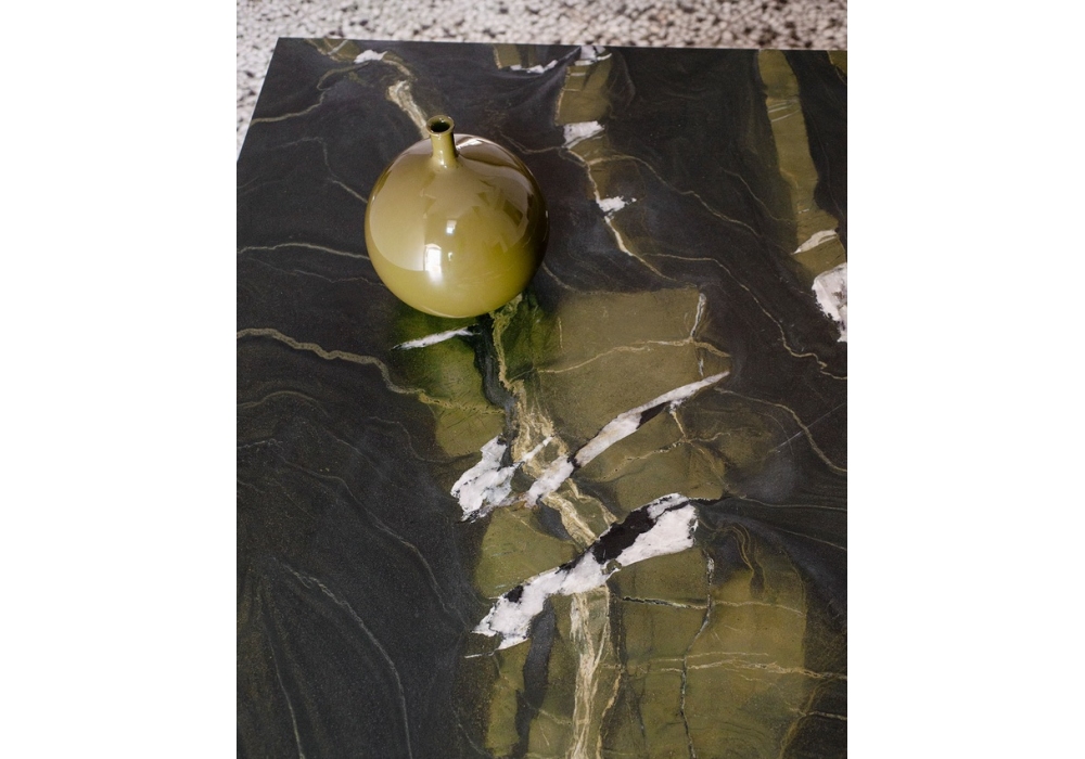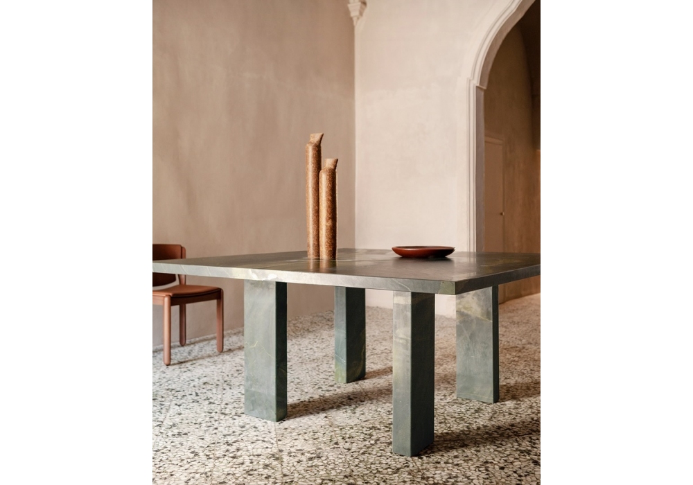 Clockwise diseñada por Michael Anastassiades para Tacchini es una mesa en mármol Verde Mediterraneo, mármol Verde Avocado con acabado mate o en madera de fresno teñido natural, en formato cuadrado o rectangular.