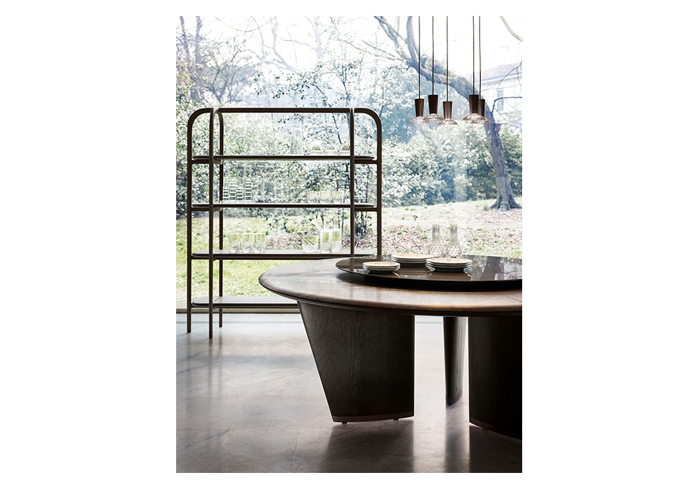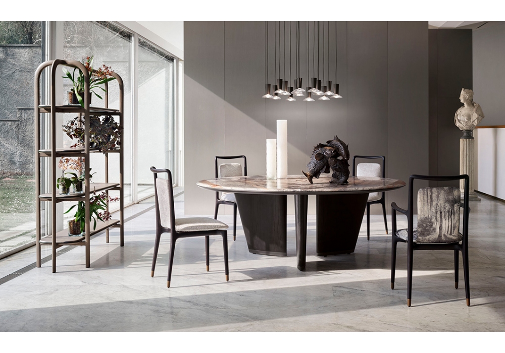 Mistral diseñada por Dainelli Studio para Giorgetti es una mesa con tapa redonda o rectangular en fresno o mármol, estructura en fresno. Disponible en diferentes acabados y tamaños.