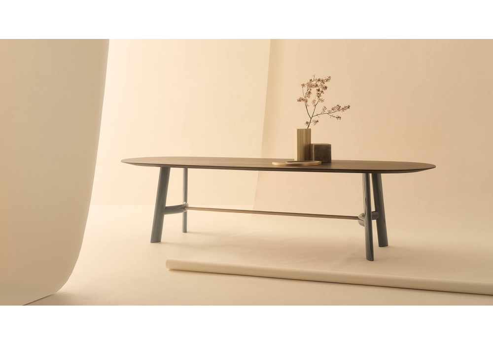 August diseñada por Roberto Lazzeroni para Lema es una mesa con estructura en madera maciza de fresno teñida de roble o madera maciza lacada brillante con travesaño central en metal color bronce patinado. La tapa es de forma cuadrangular u ovalada en madera, piedra, mármol o gres porcelánico. August está disponible en diferentes modelos y acabados.