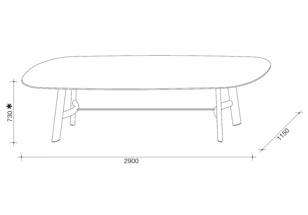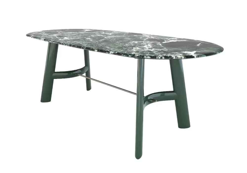 August Ovaloide diseñada por Roberto Lazzeroni para Lema es una mesa con estructura de madera maciza de fresno teñida de roble o madera maciza lacada brillante con travesaño central de metal color bronce patinado. La tapa es ovalada en piedra o mármol. August Ovaloide está disponible en diferentes acabados.
