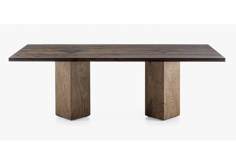 Junior B diseñada por Authentic Design para Riva 1920 es una mesa con tablero de madera maciza con listones encolados, caracterizada por patas que pasan visibles en el tablero, obtenidas de secciones de troncos de árboles y giradas en un ángulo de 45°. Disponible en diferentes acabados y dimensiones.