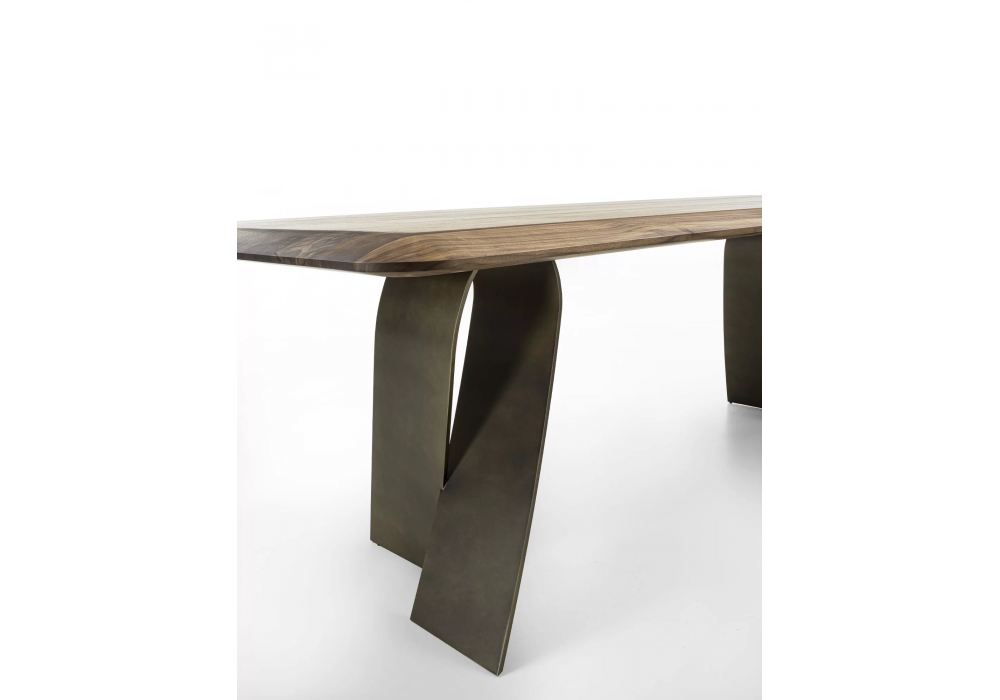 Nastro diseñada por Carlesi Tonelli para Riva 1920 es una mesa con tapa de madera maciza con listones encolados, caracterizada por espesores adelgazados mediante fabricación tipo jabón para dar ligereza y sinuosidad, combinada con patas de hierro que se enrollan sobre sí mismas para evocar la flexibilidad de una cinta. . Disponible en diferentes acabados y dimensiones.