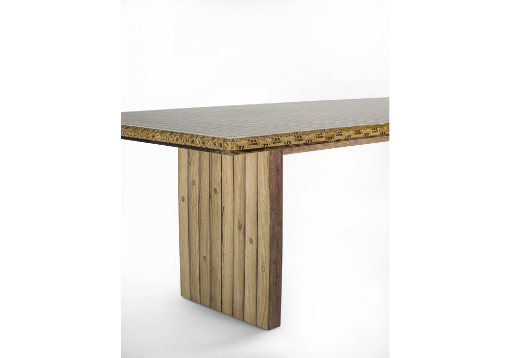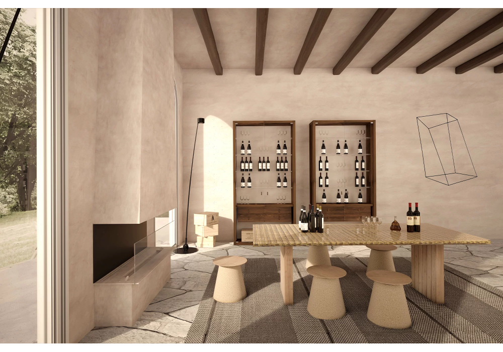 Tap Table diseñada por Authentic Design para Riva 1920 es una mesa realizada con una base de roble de las barricas y una tapa realizada con tapones de corcho sumergidos en resina.