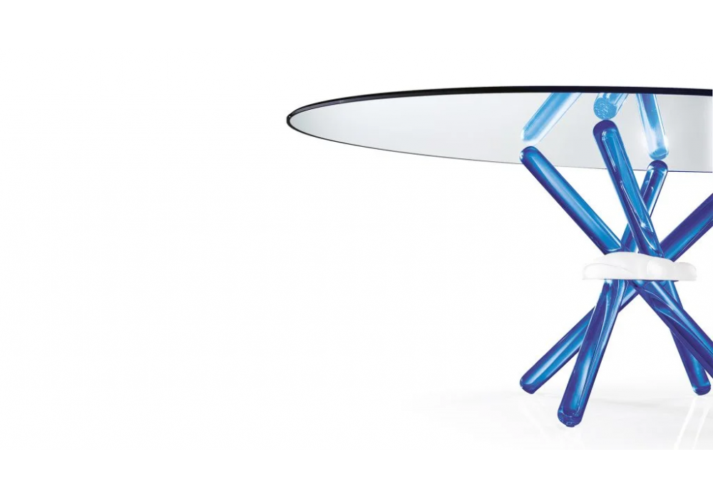 Arlequin 72 diseñada por Maurice Barilone para Reflex Angelo es una mesa realizada con una base lisa de cristal de Murano con un anillo de cristal de Murano blanco arenado o de madera. Base de cristal de Murano acanalado con aro acanalado transparente o a juego. DECO' base de cristal de Murano con anillo azul. Disponible en diferentes acabados y dimensiones.