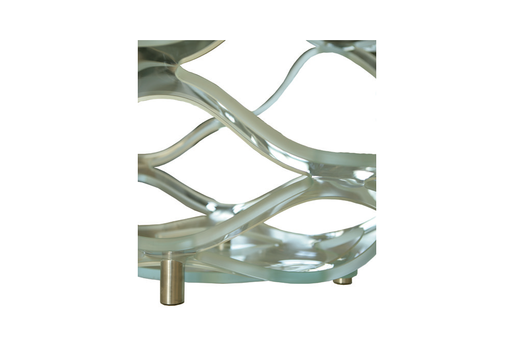 Neolitico 72 Vetro diseñada por Tulczinsky para Reflex Angelo es una mesa realizada con base redonda u ovalada en vidrio curvado transparente, lacado en negro o con acabado latón, latón oscuro o titanio. También disponible en cristal transparente extraclaro. Tapa de cristal transparente. Disponible en diferentes acabados y dimensiones.
