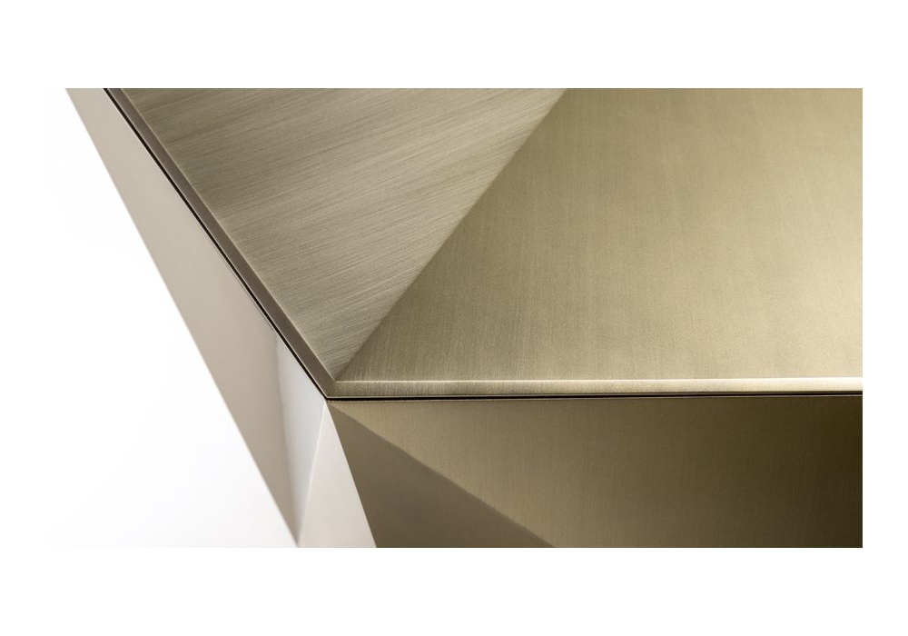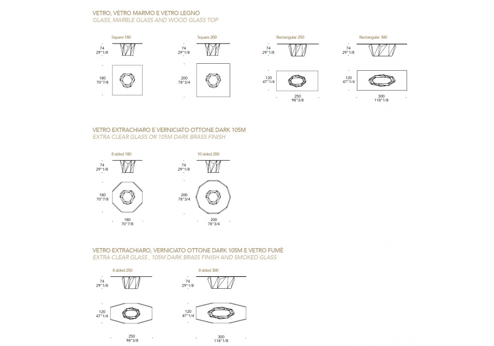 Origami 72 diseñada por Tulczinsky para Reflex Angelo es una mesa de comedor con base de madera en acabado bronce, latón, latón oscuro, titanio o Nogal Canaletto/Canaletto Henné. Tapa disponible en vidrio transparente, extraclaro, ahumado o Marmoreflex/Legnoreflex, en formas clásicas cuadradas o rectangulares u octogonales/decagonales con biseles.