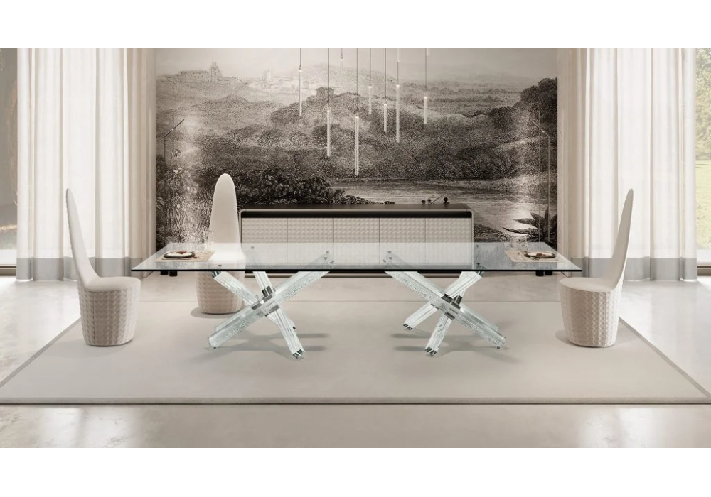 Transeo 72 Craquelè diseñada por Tulczinsky para Reflex Angelo es una mesa de comedor con base de 3 o 4 patas en vidrio craquelado extraclaro. Tapa de cristal transparente.