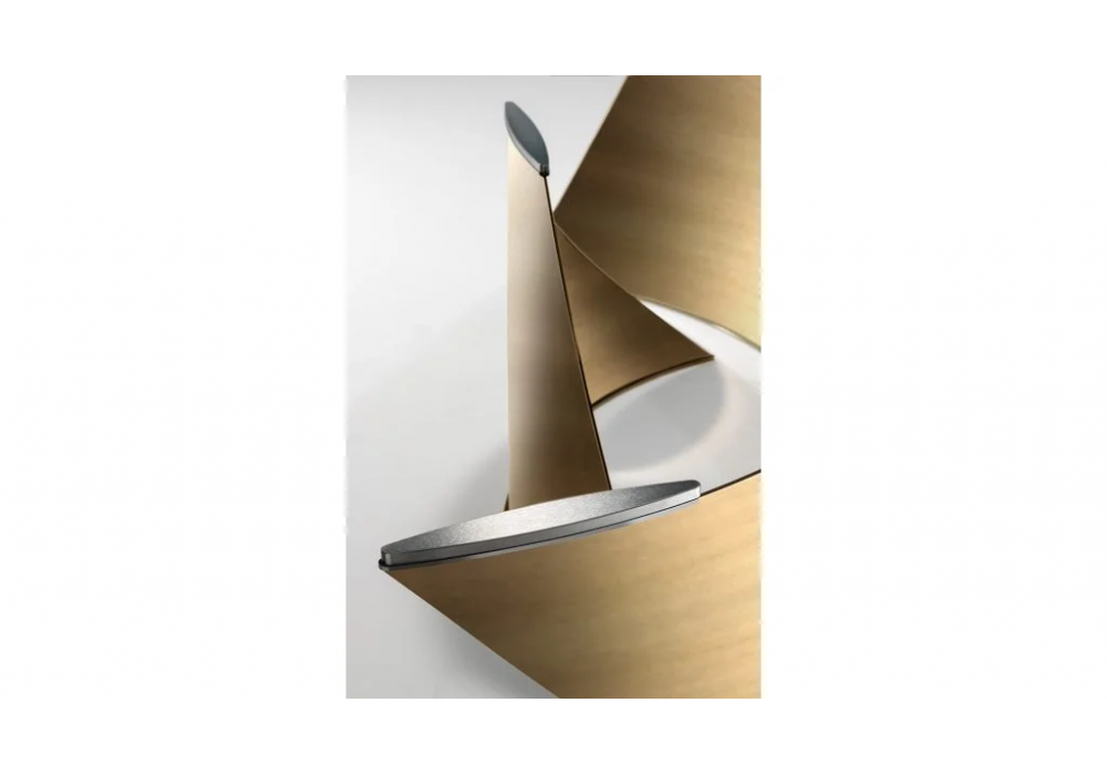 Vele 72 diseñada por Reflex Angelo es una mesa de comedor con bases curvadas de metal en acabado satinado: latón, latón oscuro, titanio. Tapa de cristal con borde pulido.