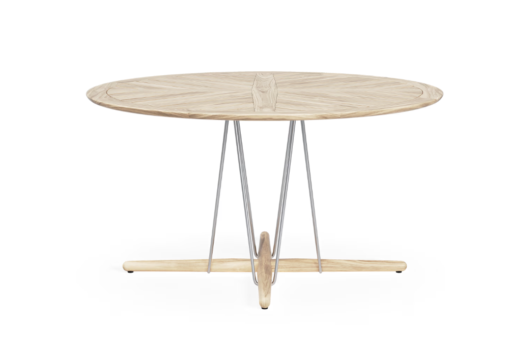E022 Embrace diseñada por Eoos para Carl Hansen & Søn es una mesa de exterior con tablero y base de madera maciza de teca sin tratar. Estructura de acero inoxidable. Disponible en varias dimensiones.