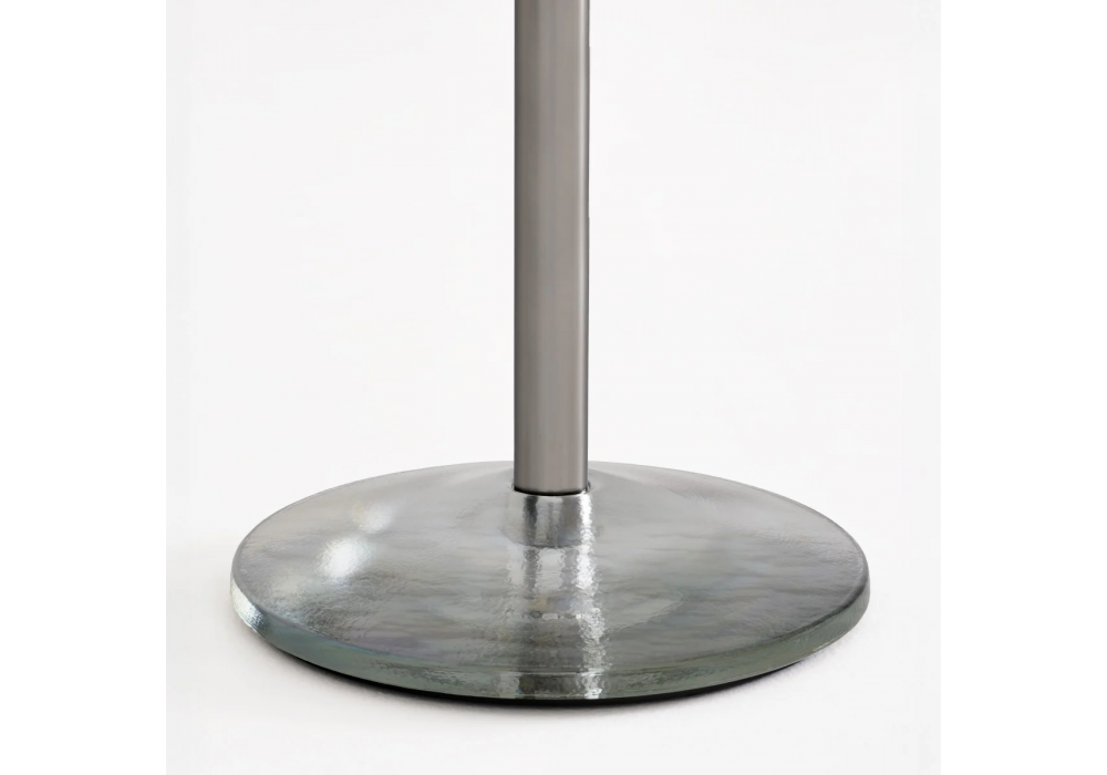 Contro Peso diseñada por Ronan Bouroullec para Glas Italia es una mesa con tablero de vidrio laminado y superficie ondulada de apariencia líquida, sostenida por una base compuesta por un tubo de acero inoxidable pulido espejo y un pie cónico de vidrio fundido, espejado mediante plateado manual. El tablero es desmontable y se fija a la base mediante una placa de acero inoxidable pulido a espejo. Disponible en diferentes acabados y dimensiones.
