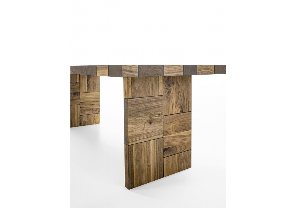 Tableau diseñada por Authentic Design para Riva 1920 es una mesa con tapa y patas realizadas con bloques de madera maciza recuperada y unidas con resina negra. Disponible en diferentes dimensiones y acabados.