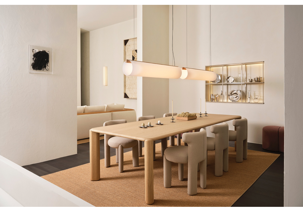 Frank diseñada por Andrea Parisio para Meridiani es una mesa realizada en chapa de roble flameado o lacada con acabado mate o brillante.