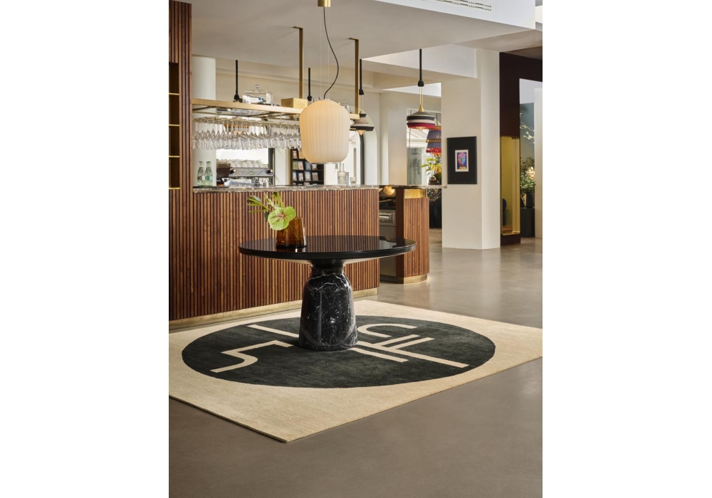 Bell Dining Table diseñada por Sebastian Herkner para ClassiCon es una mesa realizada con una base en mármol Nero Marquina, pulido e impregnado de metal y una tapa de acero macizo, lacado en negro. También puede tener base de mármol Verde Guatemala, pulido e impregnado en metal, y tablero de latón lacado en transparente. El tablero es de vidrio lacado en negro.