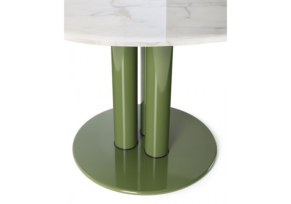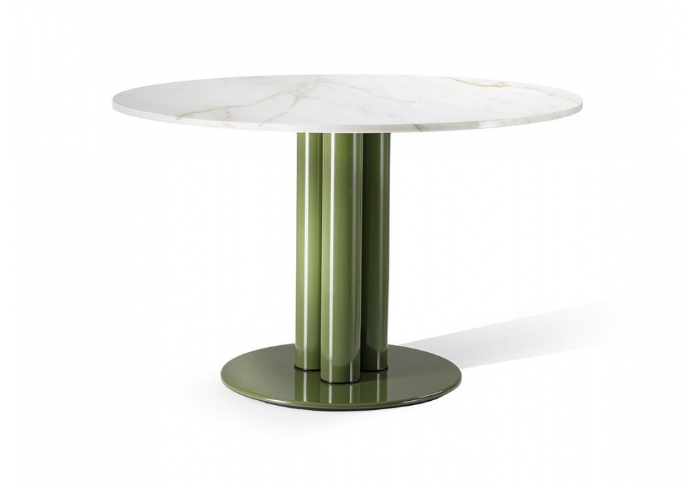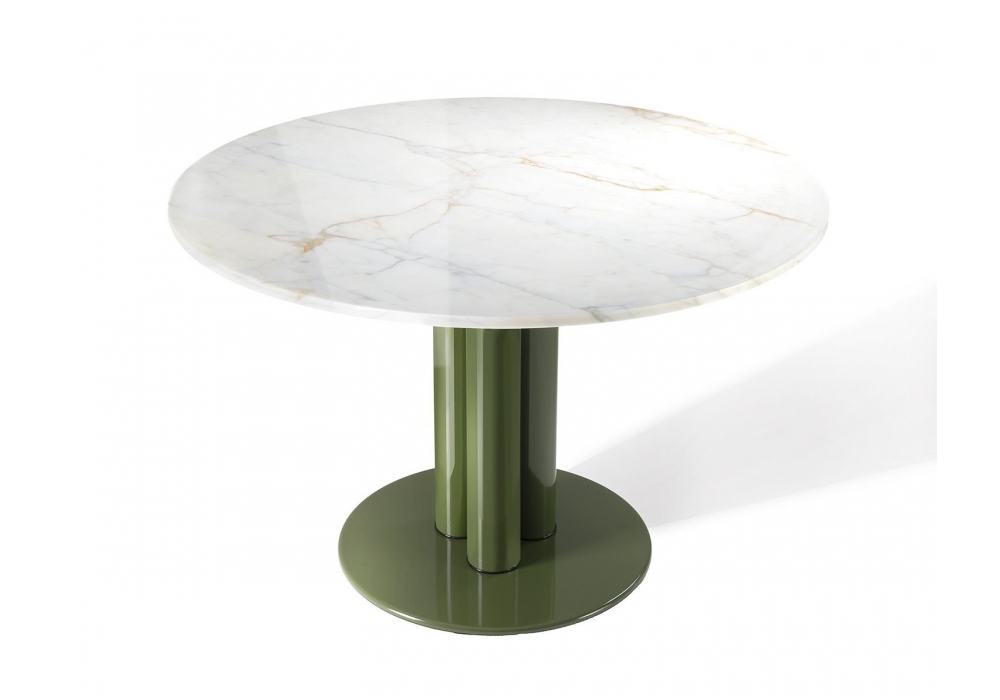 Marcuso diseñada por Marco Zanuso para Zanotta es una mesa redonda realizada con base y patas en acero pintado brillo y tablero en MDF lacado mate o brillante o en mármol Calacatta.