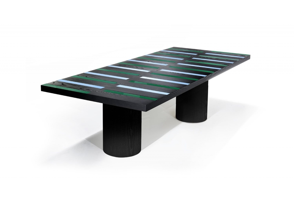 2691 Riga-Riga diseñada por Pierre Charpin para Zanotta es una mesa con tablero en madera de nido de abeja, chapado en fresno lacado a poro abierto en color negro o amaranto. Inserciones de cristal pintado en menta y azul cielo para la versión en negro, o marfil y coral para la versión en amaranto. Patas de contrachapado curvado chapado en fresno con el mismo acabado que el tablero.