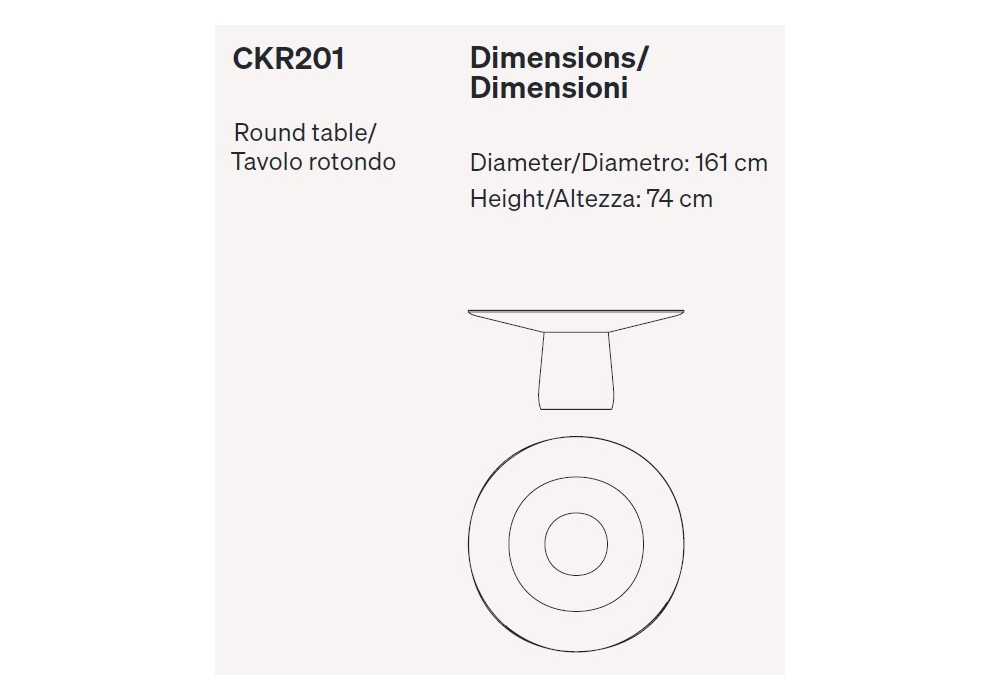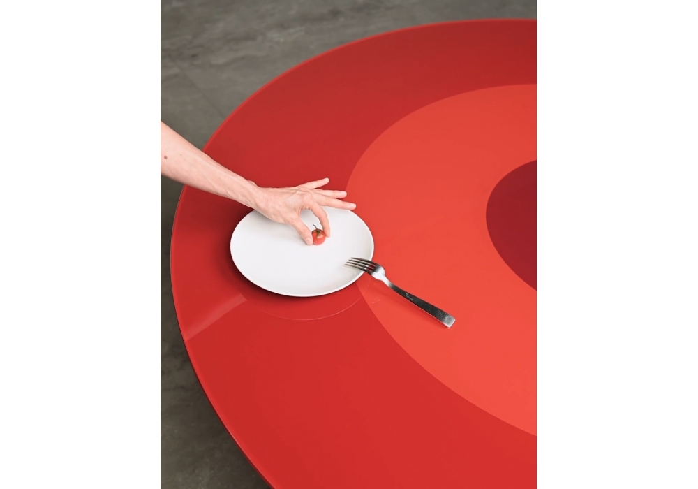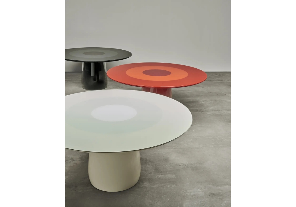 Roundel diseñada por Claesson Koivisto Rune para Baleri Italia es una mesa redonda con base central. La estructura bajo el tablero y la base central están hechas de poliuretano rígido estructural, con acabado lacado brillante en rojo, blanco o negro. El tablero está hecho de vidrio templado extraclaro pintado por la parte posterior con círculos concéntricos rojos, blancos o negros.