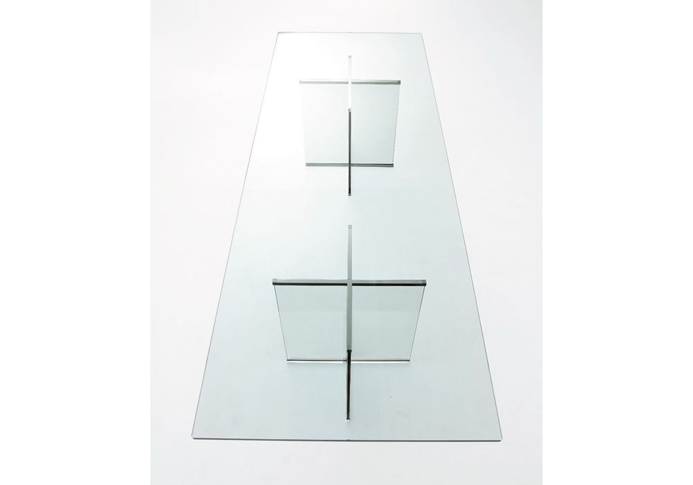Eros diseñada por Pierangelo Gallotti para Gallotti&Radice es una mesa con tapa de cristal transparente. Piezas metálicas de latón cromado. base de cristal templado de 15mm. Tamaños personalizados para arriba bajo petición. Para tapa de cristal más grande que los 240cm, se recomiendan dos bases.