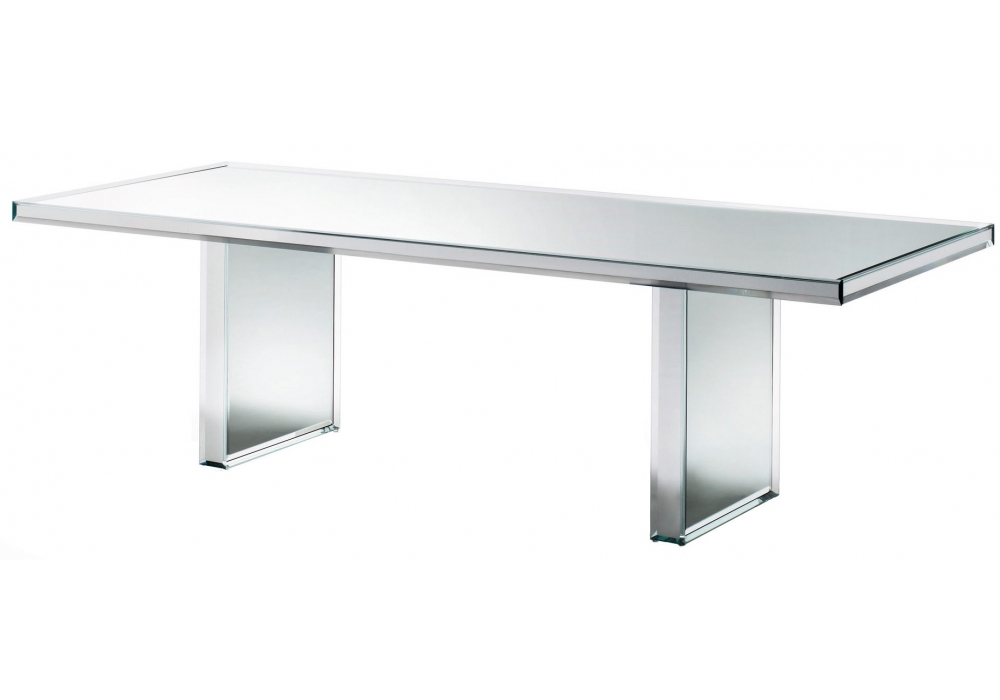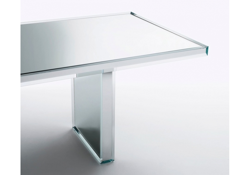 Prism Mirror Table diseñada por Tokujin Yoshioka para Glas Italia es una mesa en vidrio extralight transparente plateado de 12 mm. Las bases se fijan a la parte superior mediante placas metálicas y tornillos.