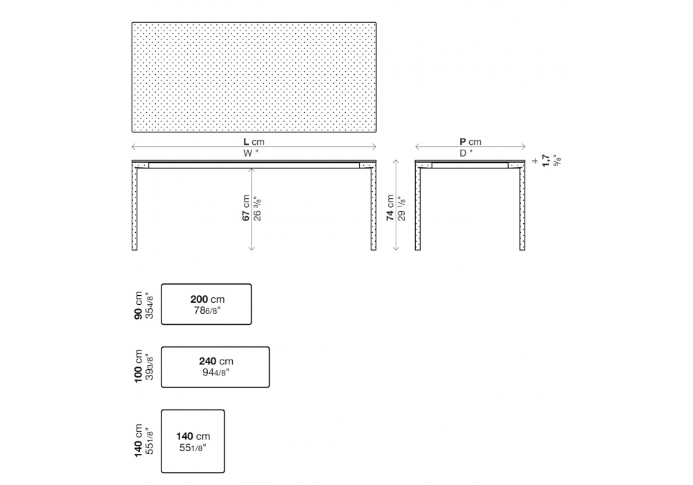 | Dimensiones | 200 x 90 x H 74 cm; 240 x 100 x H 74 cm; 280 x 100 x H 74 cm; 140 x 140 x H 74 cm. |