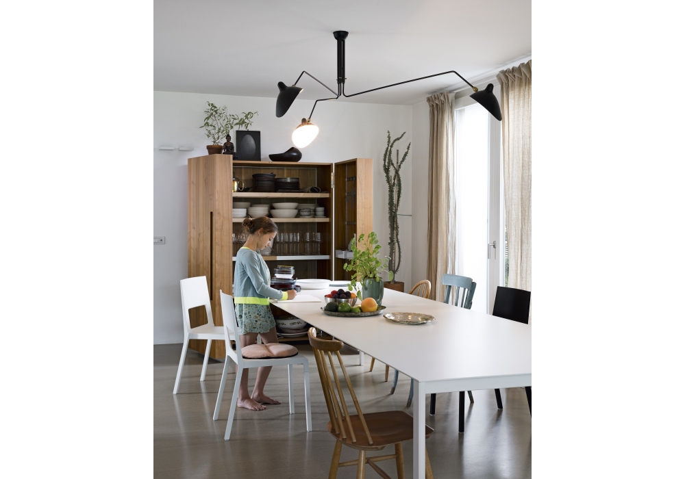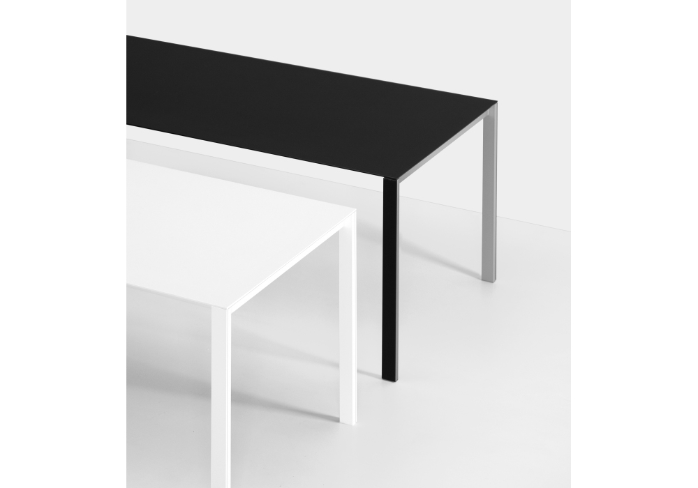 Thin-K diseñada por Luciano Bertoncini para Kristalia es una colección de mesas disponible en versión fija o extensible. Patas en acero barnizado, acabado top, detalles exteriores en pata y extensión en aluminio barnizado.