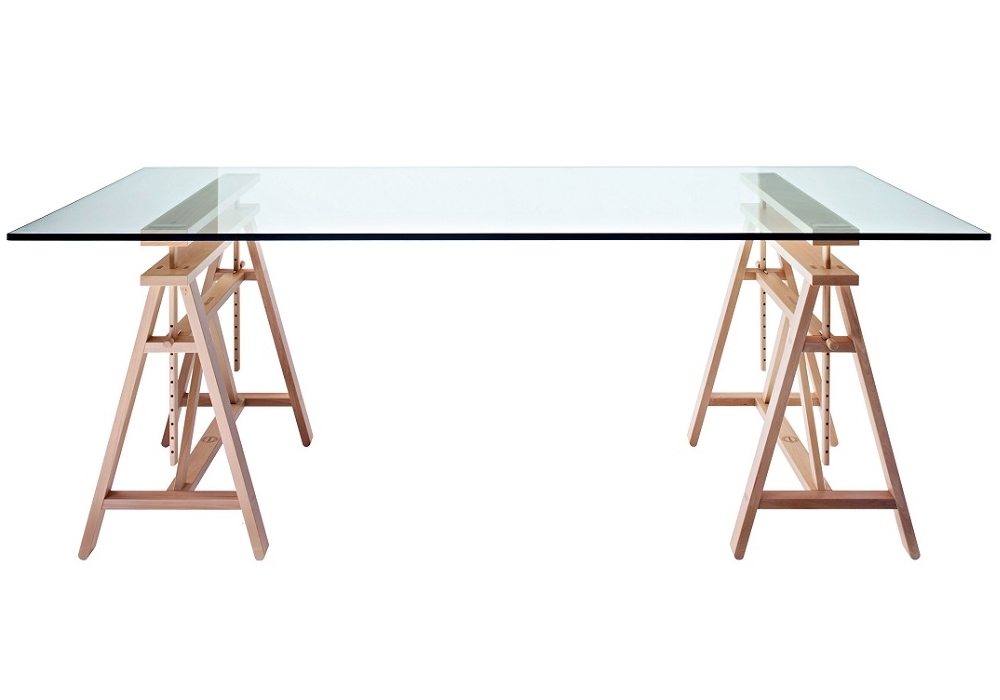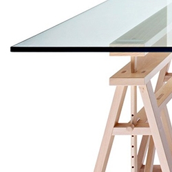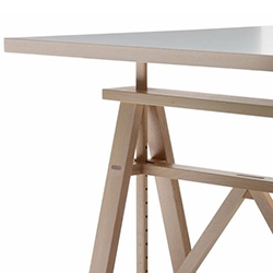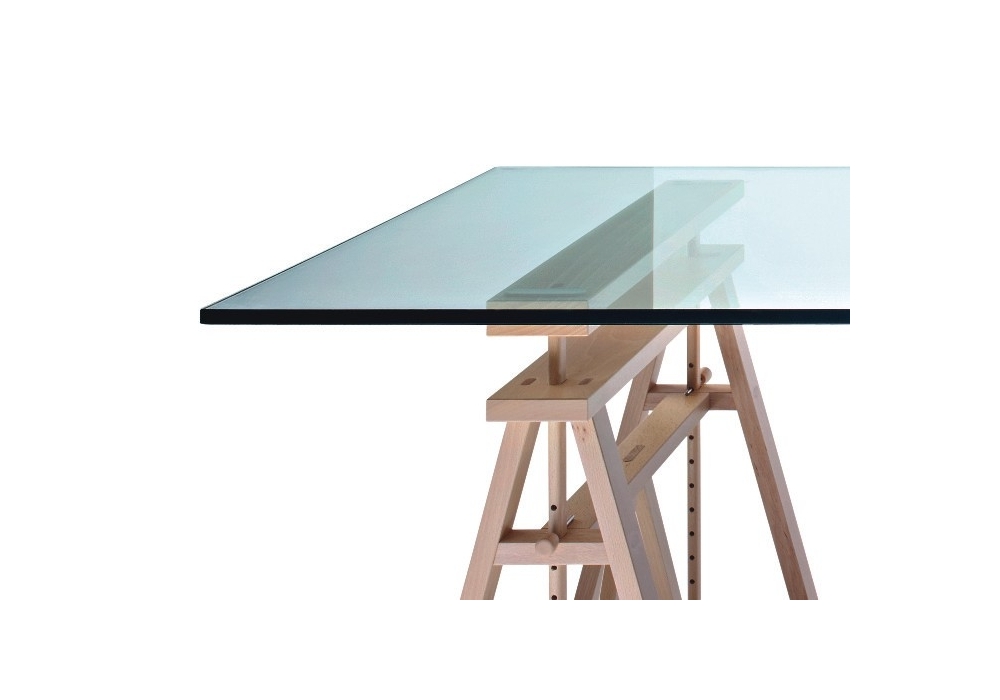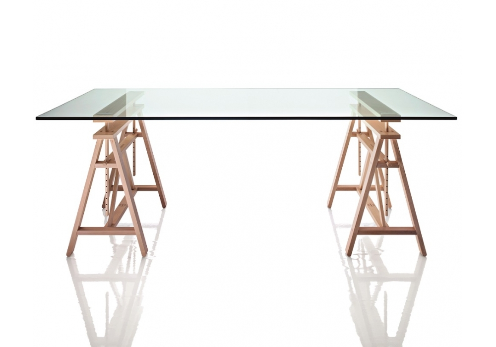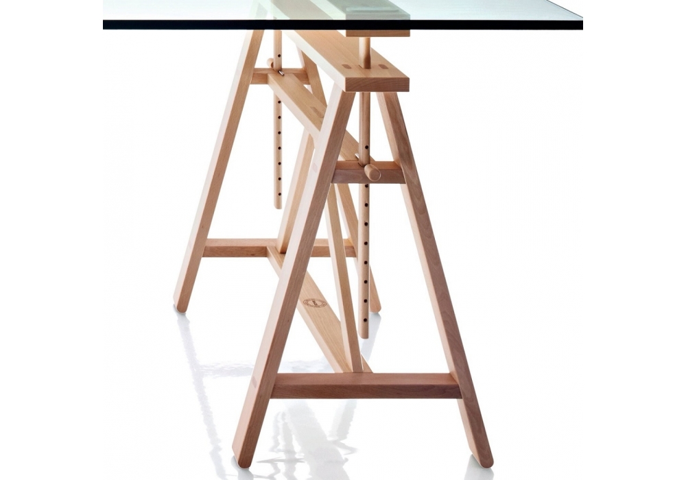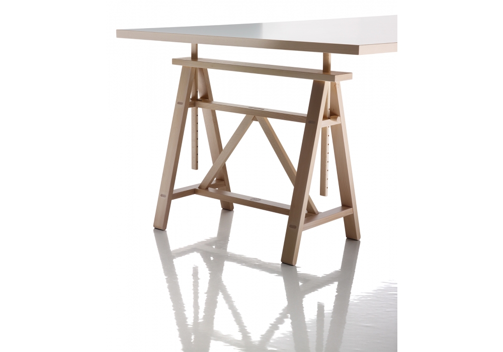 Teatro diseñada por Marc Berthier para Magis es una mesa compuesta por un par de caballetes regulables en altura realizados en haya maciza. Sobre en cristal templado o MDF laminado (blanco por un lado y negro por el otro) con canto de haya natural.