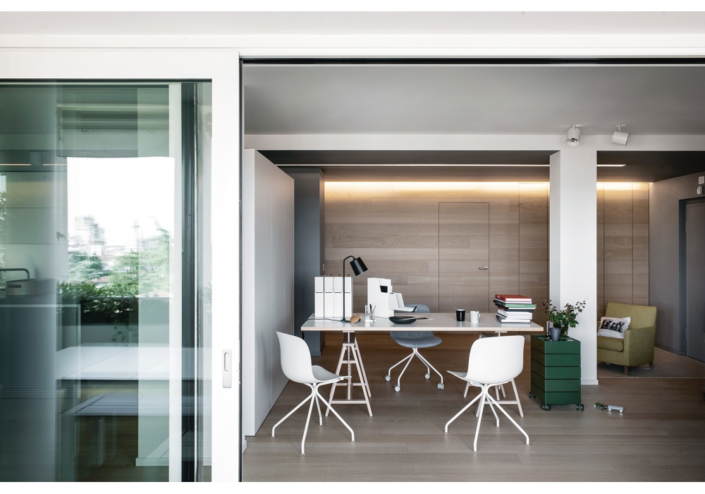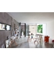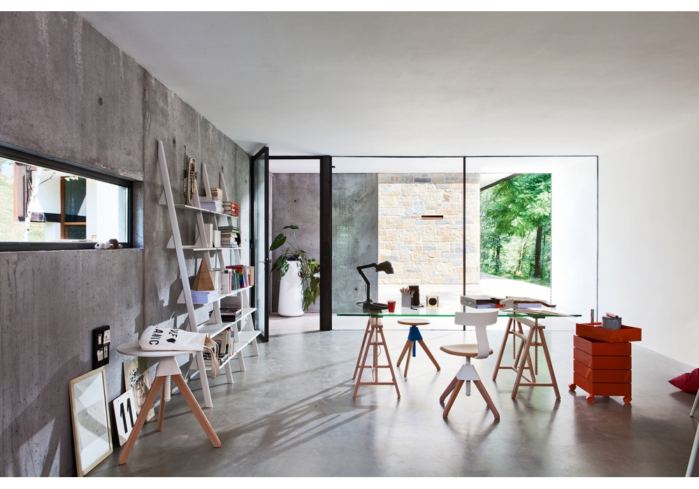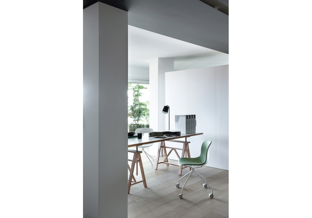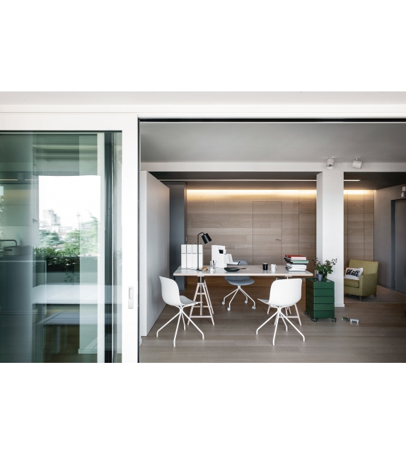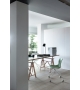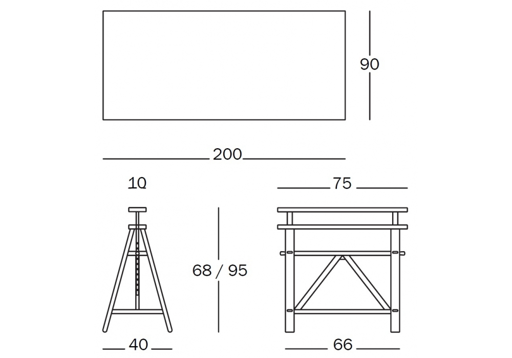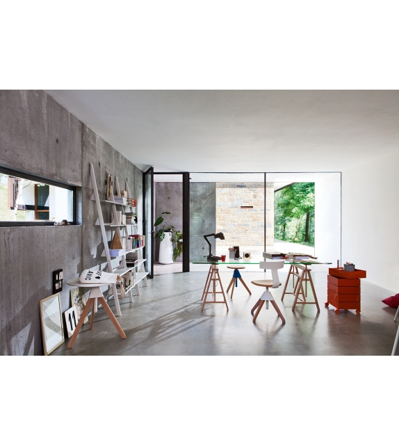 Teatro diseñada por Marc Berthier para Magis es una mesa compuesta por un par de caballetes regulables en altura realizados en haya maciza. Sobre en cristal templado o MDF laminado (blanco por un lado y negro por el otro) con canto de haya natural.