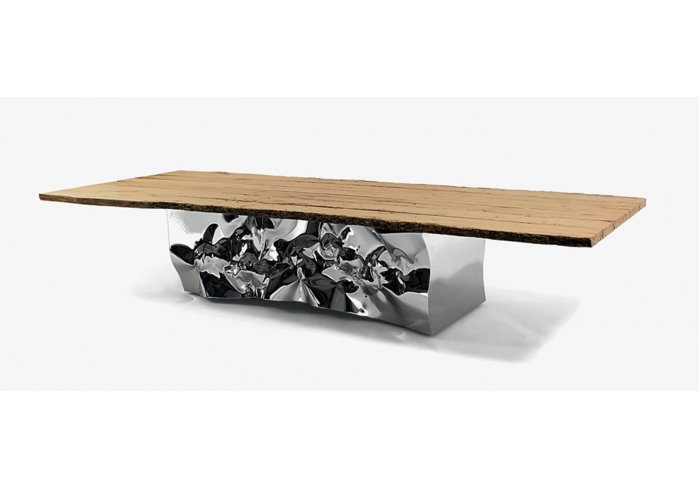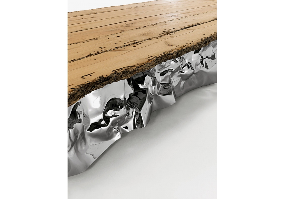 Riflessi en Laguna diseñada por Helidon Xhixha para Riva 1920 es una mesa con tapa realizada en madera maciza de Briccola, con listones yuxtapuestos y cantos naturales, combinada con una escultural base realizada en chapas de acero forjadas por el reconocido artista internacional Helidon Xhixha.