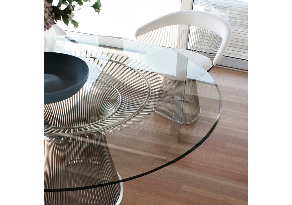 Platner diseñada por Warren Platner para Knoll es una mesa con estructura de varillas metálicas perfiladas vertical y horizontalmente, con baño de níquel y acabado protector transparente, bronce u oro de 18k. Tapa de cristal con cantos biselados o mármol en varios acabados.