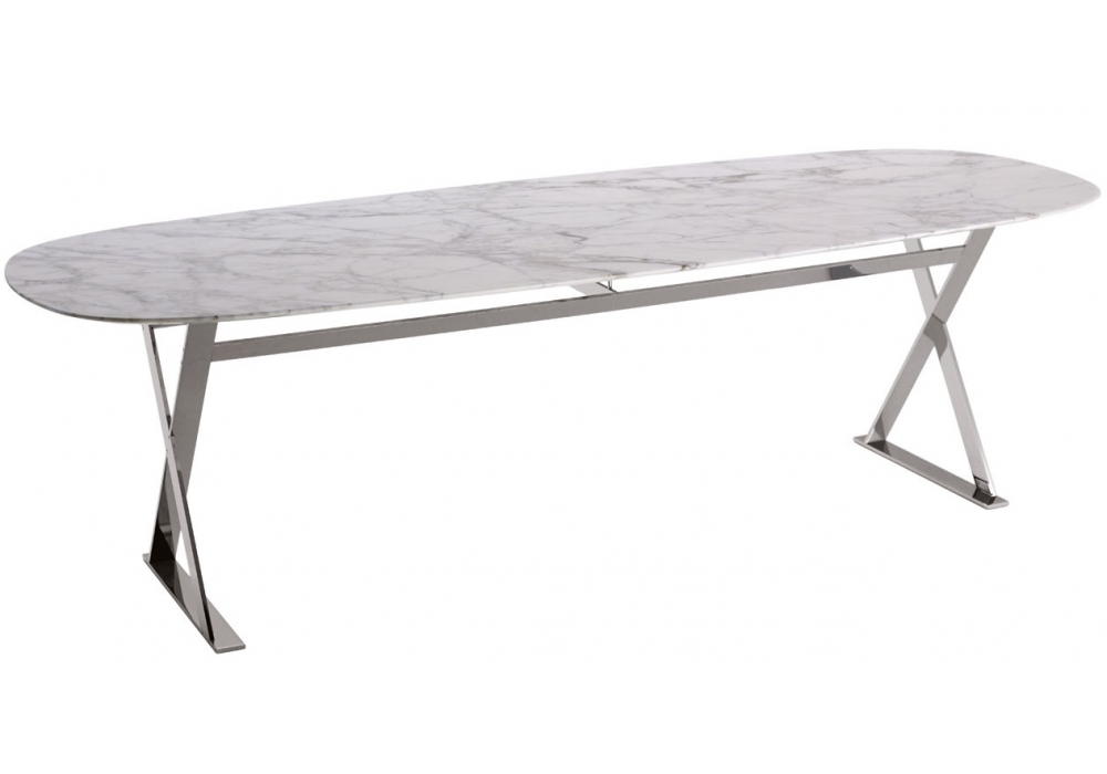 Pathos diseñada por Antonio Citterio para Maxalto es una mesa con tablero de cantos redondeados realizado en mármol en diferentes acabados. Estructura con base en forma de X en acero pintado o cromado brillante. Disponible en diferentes medidas.