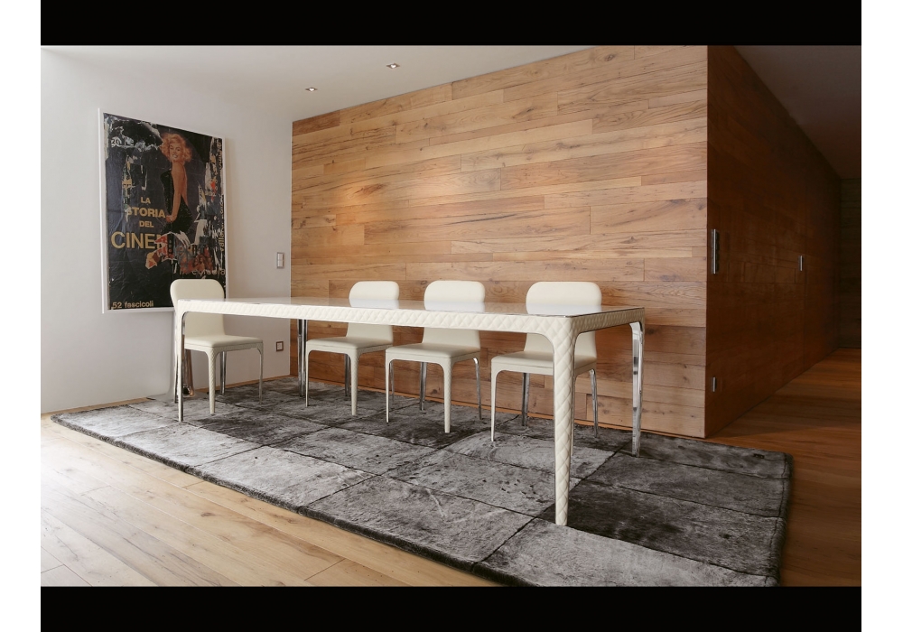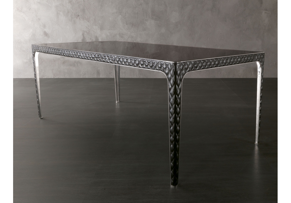 Alexander diseñada por Rugiano es una colección de mesas disponibles en diferentes tamaños y acabados, se caracteriza por acabados matellassè y perfiles en acero pulido o bronce.