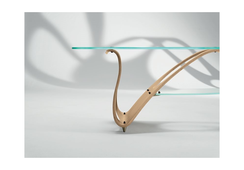 697 Arabesco diseñado por Carlo Mollino para Zanotta es una mesita con estructura en madera contrachapada aplacada en roble natural. Sobres de cristal templado.