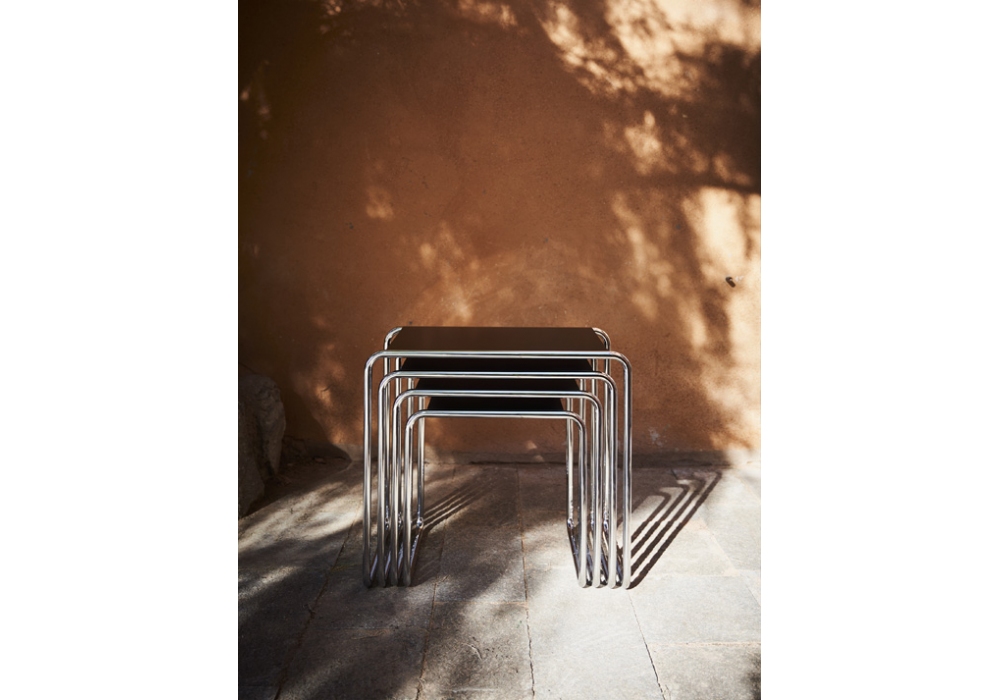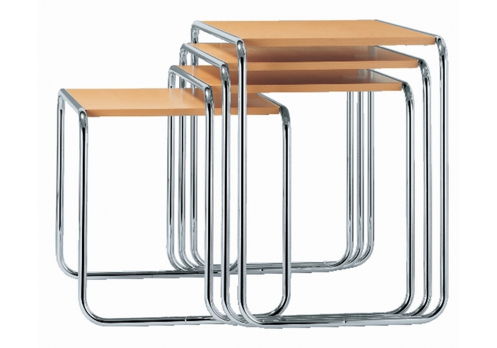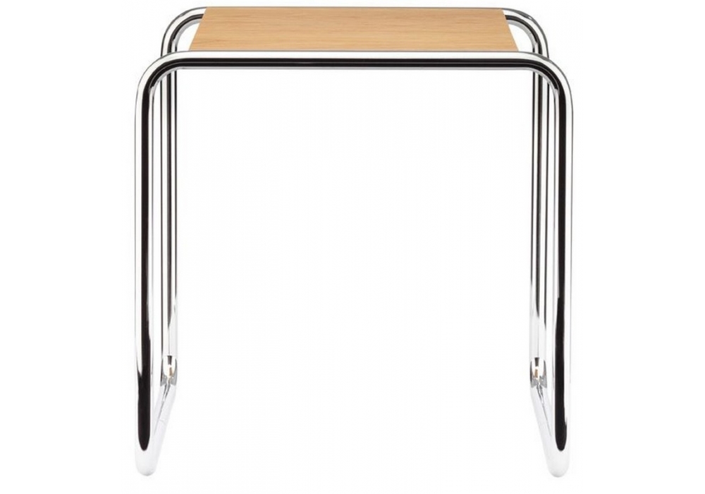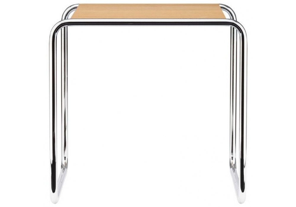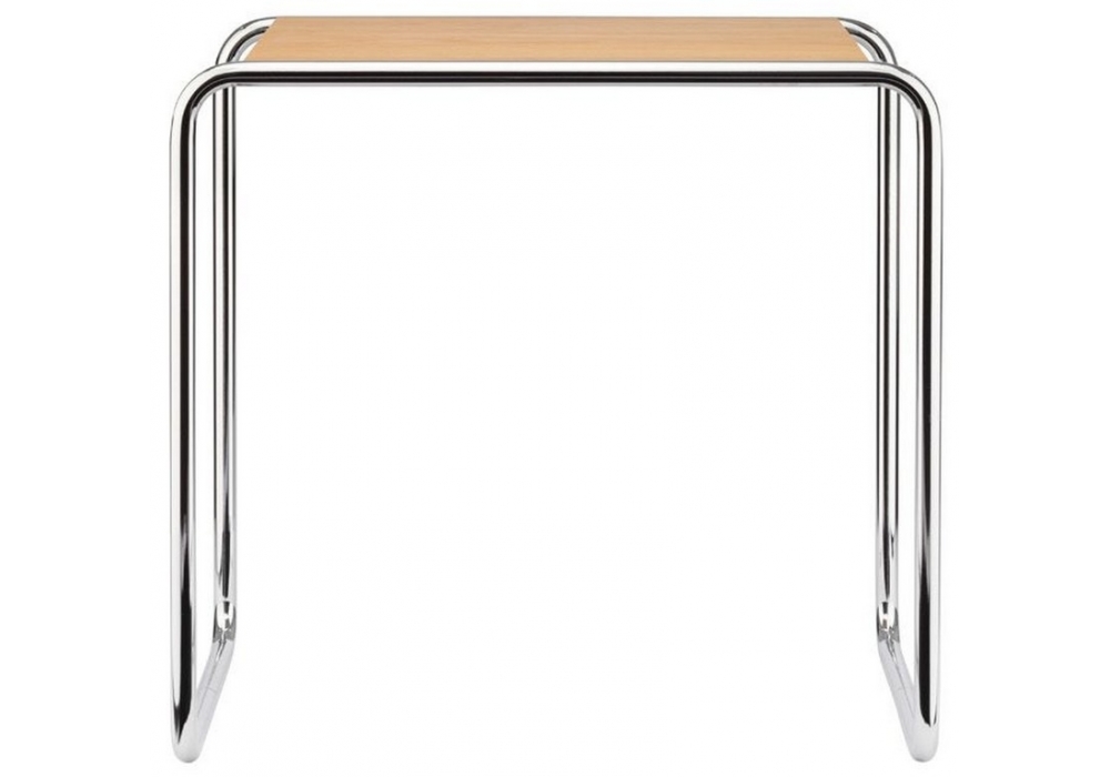 B 9 diseñada por Marcel Breuer para Thonet es una mesa auxiliar con estructura en tubo de acero cromado o pintado en diferentes colores. Tapa en MDF, haya o cristal. Disponible en diferentes acabados y medidas.