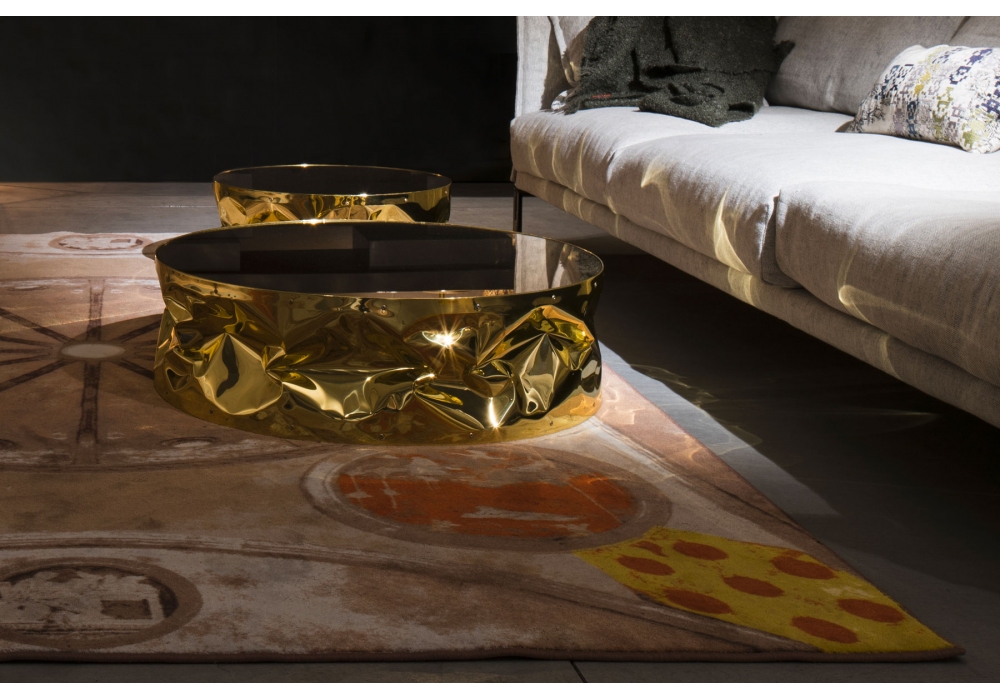 Tab.u diseñada por Bruno Rainaldi para Opinion Ciatti es una mesita con ruedas, en aluminio arrugado a mano con estructura interna en madera contrachapada y tapa de espejo. Disponible en diferentes acabados y dimensiones.