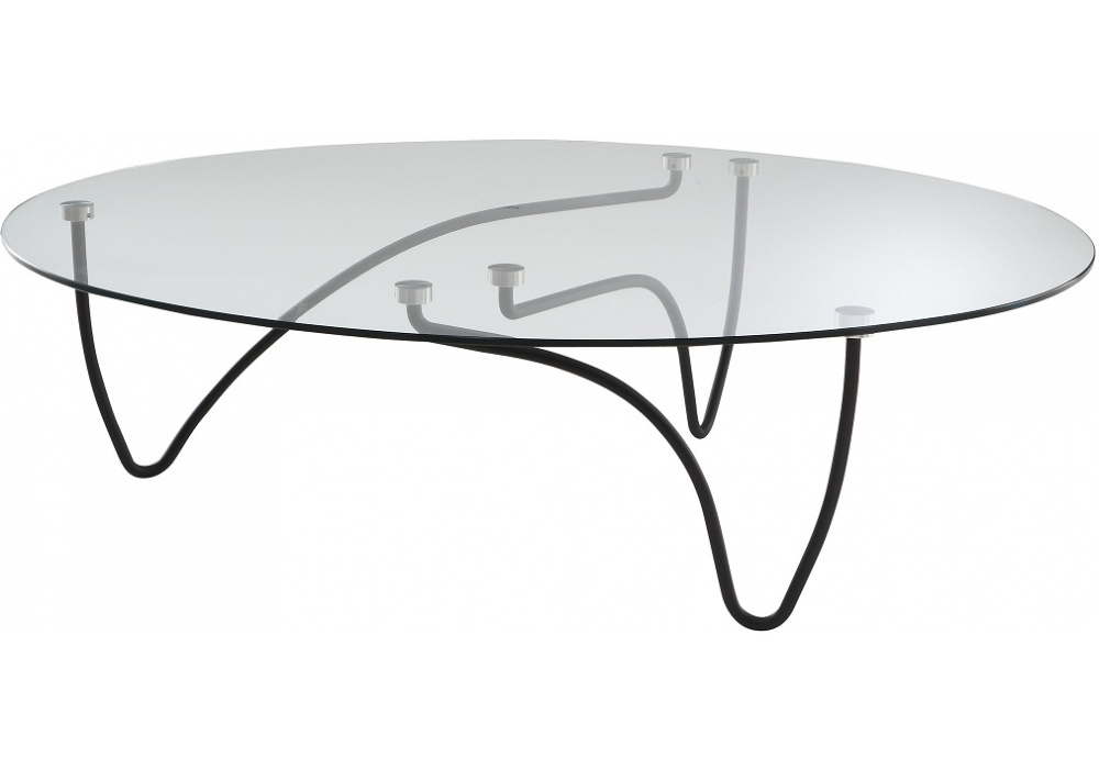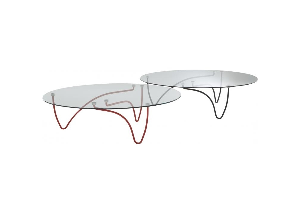 Rythme designed by Angie Anakis for Ligne Roset is a low table with top in 8 mm thick clear toughened glass. Matt lacquered circular steel base Ø 15 mm. Plates (Ø 35 mm) to take the base are glued to the underside of the top.